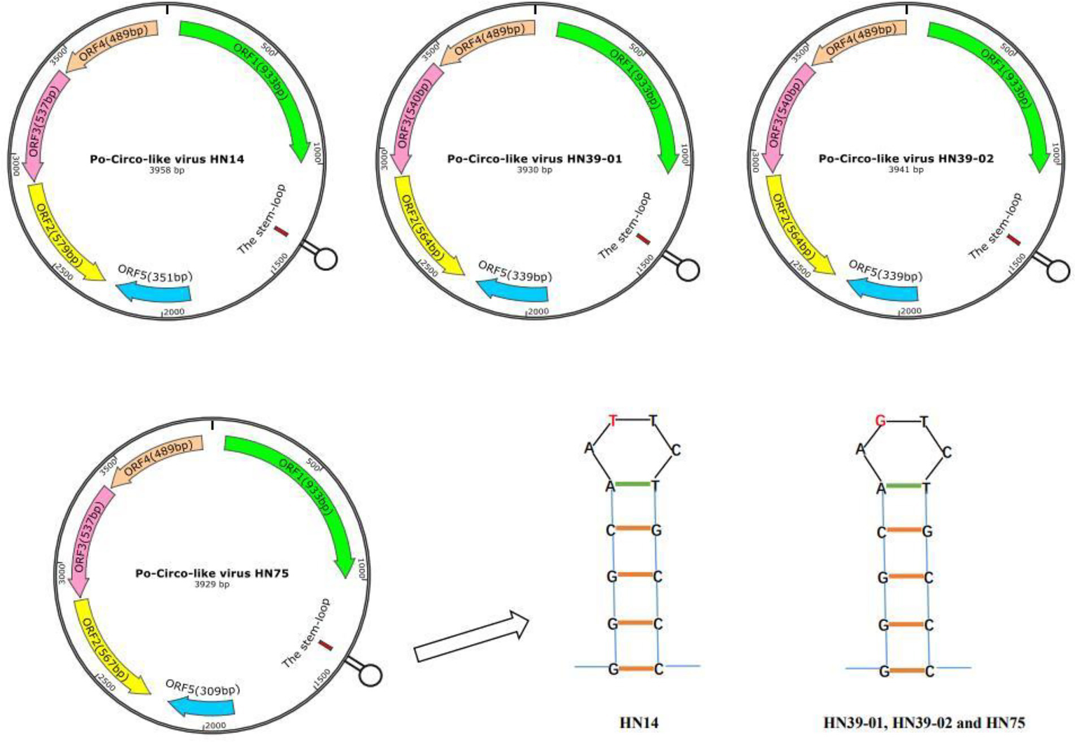 Subsequently, the full genomes of four strains were sequenced, and their gene characteristics were further analyzed (Figure 1). First, SnapGene software (version 4.2.4; from Insightful Science; available at snapgene.com) was used to assemble the genome sequences together and draw the complete gene map. The NCBI Open Reading Frame (ORF) Finder2 was used to identify the putative main ORFs of PCL virus. The stem-loop structure of PCL virus was verified using the Mfold web server (Zuker, 2003; Hao et al., 2021).3 The genomes of these strains were all circular, with a Rep protein and a stem loop of the same length (Figure 1). Five potential ORFs, each with at least 100 amino acids, were identified. Of the revealed ORFs, the largest ORF was named ORF1, and it enco-des a replication-associated protein (Rep). PCVs have a stem-loop structure (Cheung, 2007), while PCL viruses also have a stem-loop containing 14 nucleotides (Sun et al., 2021). Unlike PCVs, PCL viruses do not express the Cap protein. Stem loop of four strains PCL virus includes GGGCAATTCTGCCC and GGGCAAGTCTGCCC (Figure 1). The effect of stem-loop structure on virus needs to be further studied.