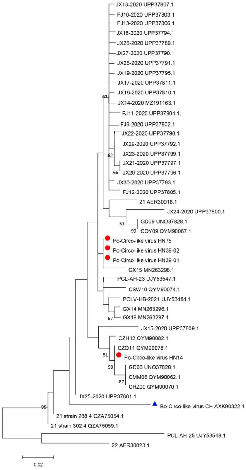 Phylogenetic trees based on the rep gene sequences of the Po-Circo-like virus and the Bo-Circo-like virus. The evolutionary history was inferred by using the Maximum Likelihood method based on the JTT matrix-based model, and 1,000 bootstrap replicates in MEGA 7.0 software. The percentage of trees in which the associated taxa clustered together is shown next to the branches. Red circles indicate the strains detected in this study, and blue triangle indicate the strains that were derived from cattle.