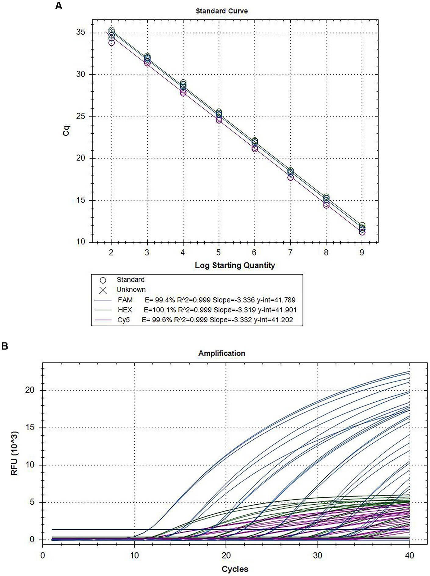 Amplification curves and standard curves of the triplex assay. The mixed plasmids of 109 copies/assay to 102 copies/assay plasmid was used as the template for qRT–PCR. The standard curve (A) and the amplification curve (B) of the triplex assay was generated by plotting the Cq values (X-axis) against the logarithm of copy numbers of plasmids (Y-axis).