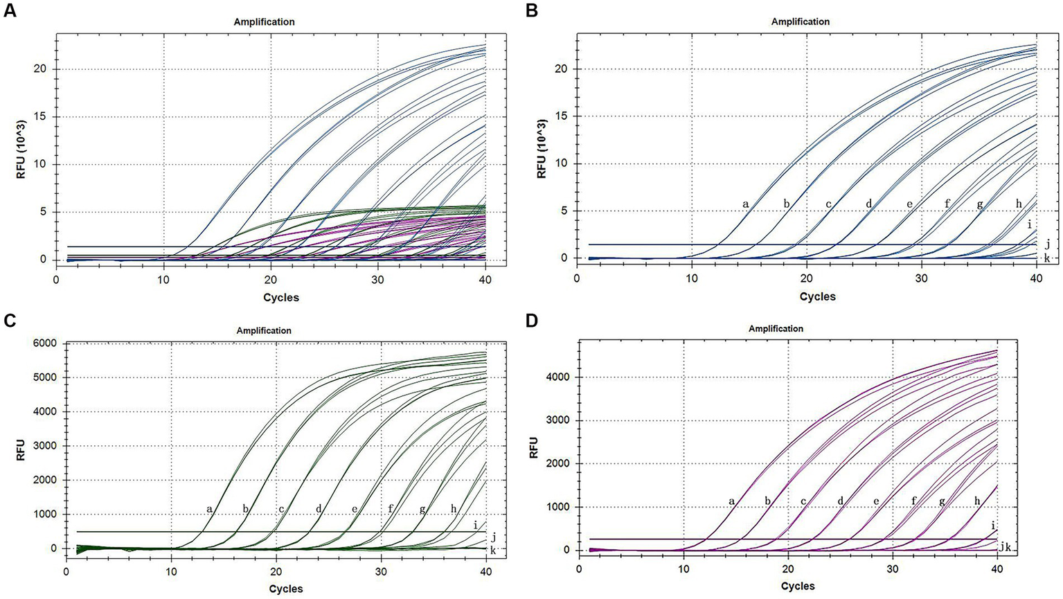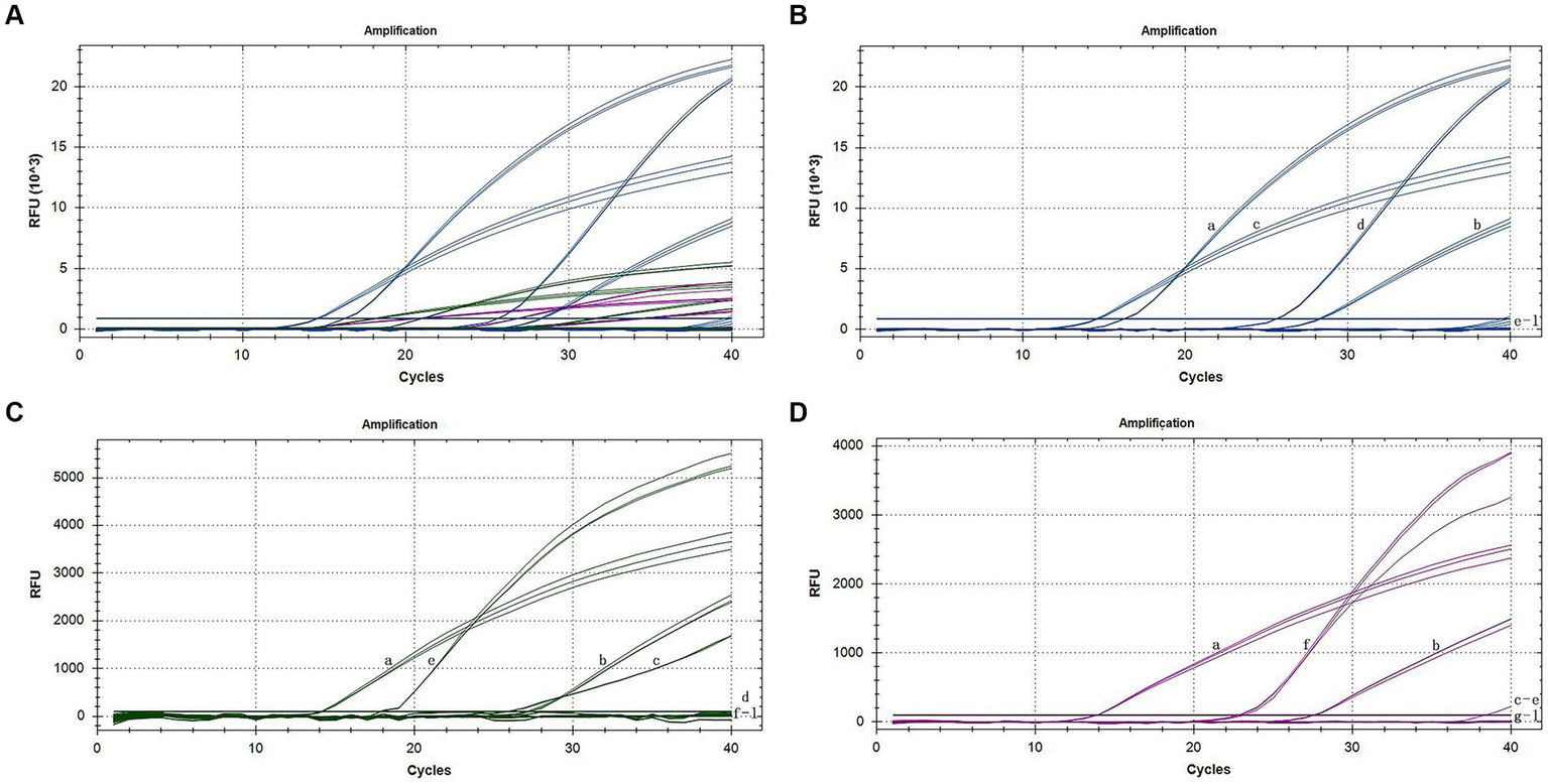 Specific amplification curves of the triplex assay (A). Specific amplification curves of the triplex assay for the detection of FAM channel (CymMV) (B), HEX channel (ORSV) (C), and Cy5 channel (CymRSV) (D). Among them, a: positive sample with CymMV, ORSV and CymRSV; b: sample with CymMV, ORSV and CymRSV; c: sample with CymMV and ORSV; d: sample with CymMV; e: sample with ORSV; f: sample with CymRSV; g–j: samples with CMV, TMV, CarMV, LMoV, respectively; k: negative sample; l: H2O.