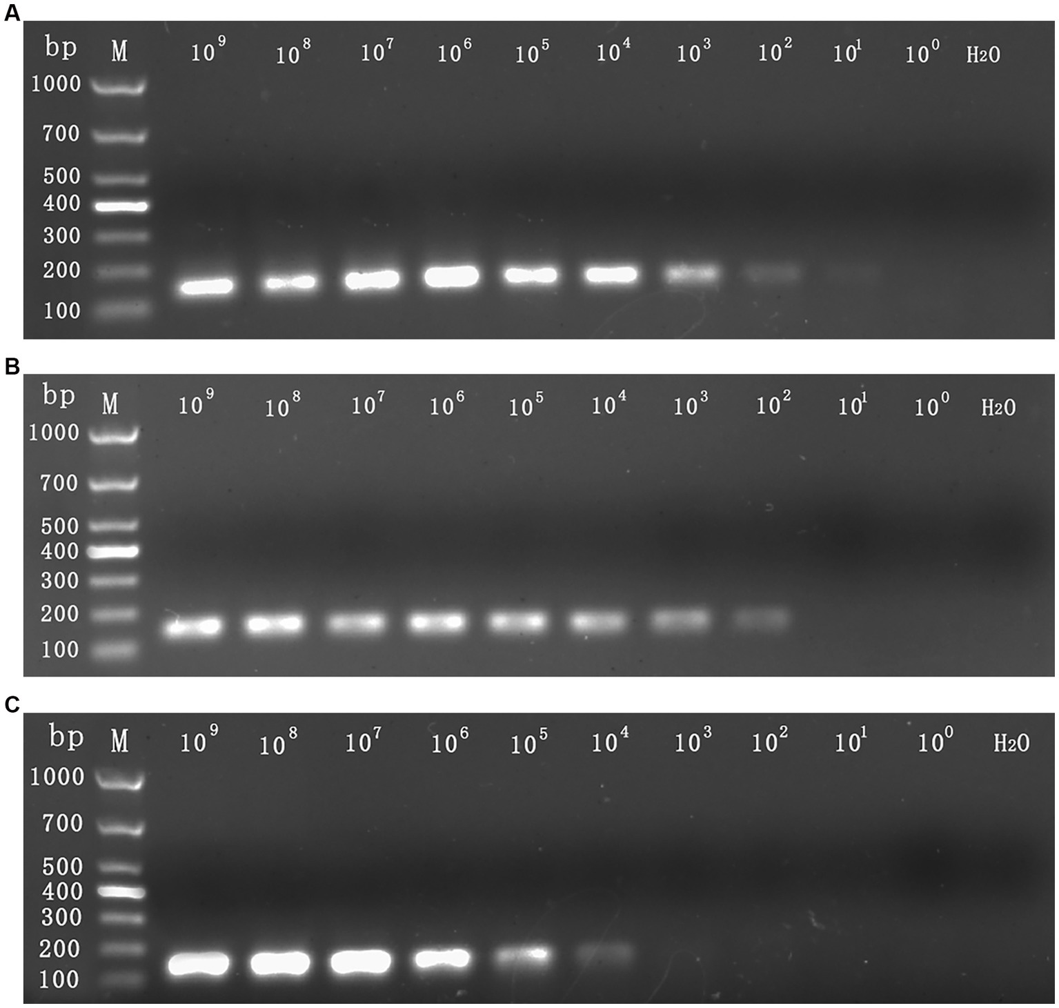 The sensitivity detection limit of RT–PCR. The mixed 109 copies/assay to 1 copy/assay plasmid was used as the sensitivity tests templates. The detection limit for CymMV (A) and ORSV (B) was 102 copies/assay, the detection limit for CymRSV (C) was 104 copies/assay.