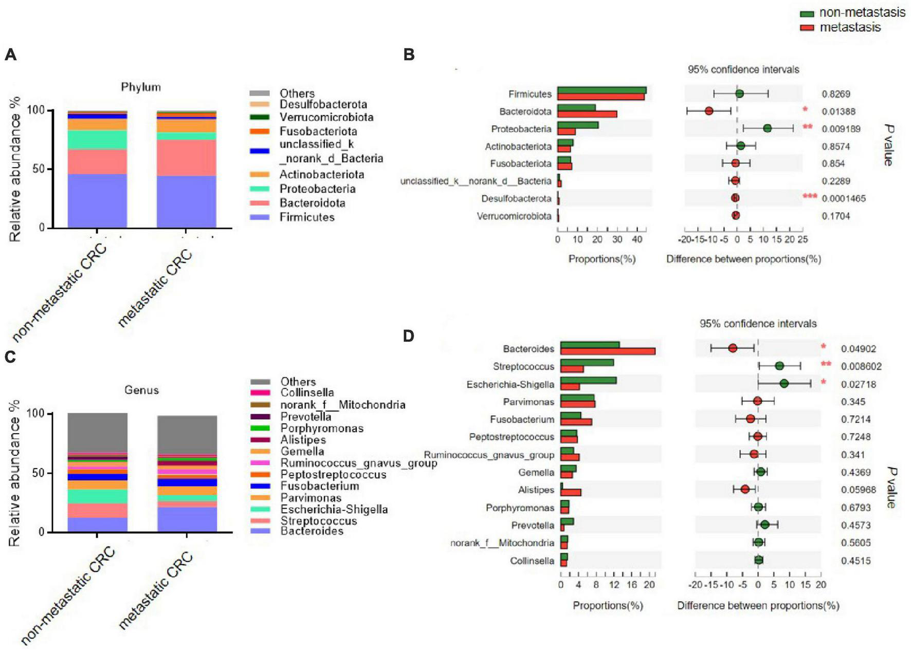 The microbial composition of tumor tissues from metastatic and non-metastatic colorectal cancer (CRC) groups. (A) Histograms of the predominant bacterial phyla of tumor tissues from metastatic and non-metastatic CRC groups. (B) The phylum-level bacterial proportion difference analysis between metastatic and non-metastatic CRC groups. (C) Histograms of the predominant bacterial genera of tumor tissues from metastatic and non-metastatic CRC groups. (D) The genus-level bacterial proportion difference analysis between metastatic and non-metastatic CRC groups. Metastatic CRC group, n = 48; non-metastatic CRC group, n = 44. The Wilcoxon rank-sum test was used in patterns (B,D). *P < 0.05; **P < 0.01; ***P < 0.001.