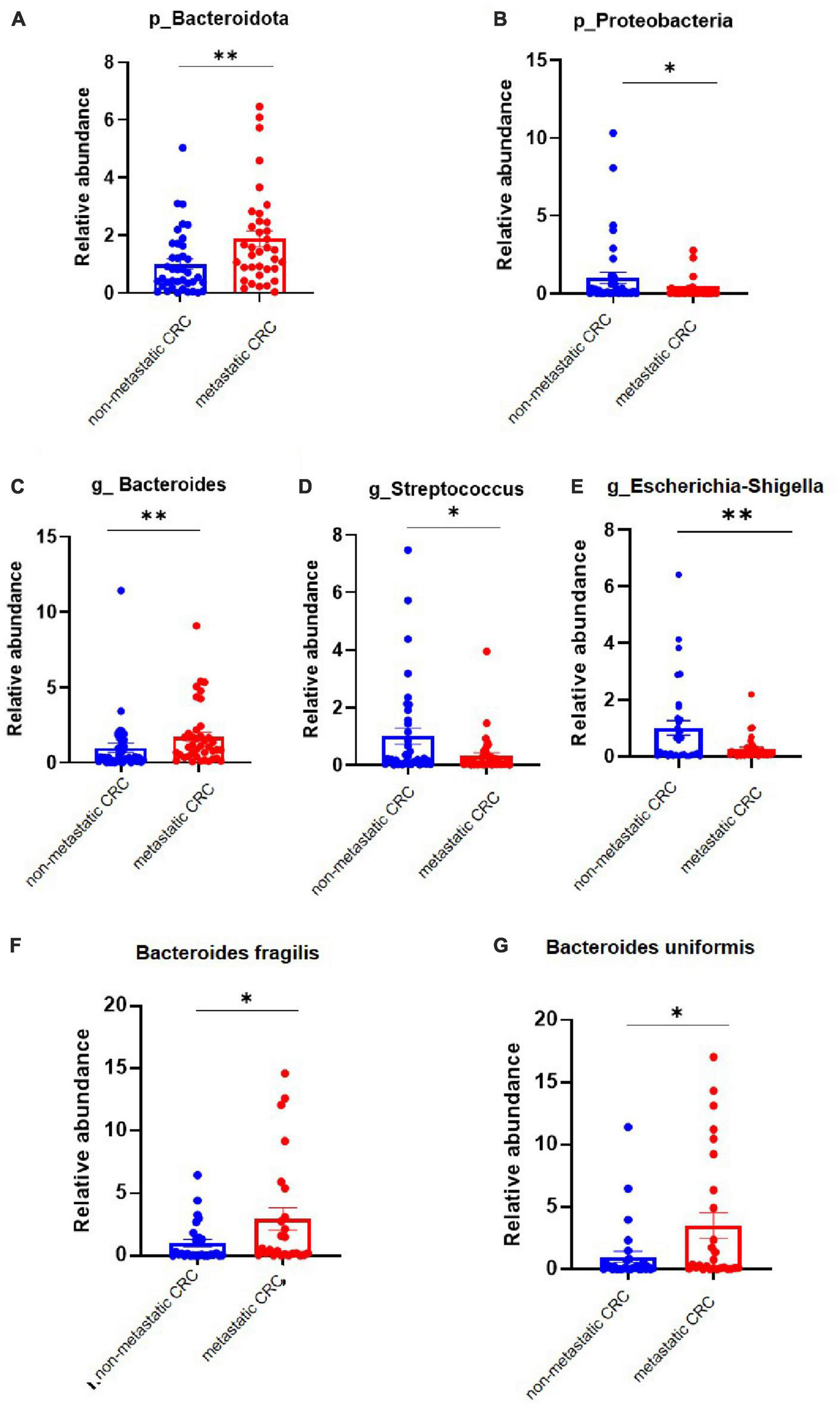 The differential bacteria between the metastatic and non-metastatic colorectal cancer (CRC) groups were confirmed by polymerase chain reaction (PCR). (A,B) Relative abundance of the Bacteroidetes and Proteobacteria phyla. Metastatic CRC group, n = 48; non-metastatic CRC group, n = 44. (C–E) Relative abundance of the Bacteroides, Streptococcus, and Escherichia-Shigella genera. Data below the limit of detection were removed; metastatic CRC group, n = 30; non-metastatic CRC group, n = 27. (F,G) Relative abundance of Bacaeroides fragilis and Bacteroides uniformis. Metastatic CRC group, n = 48; non-metastatic CRC group, n = 44. Data are presented as the mean ± SEM; *p < 0.05; **p < 0.01 by unpaired Student’s t-test.