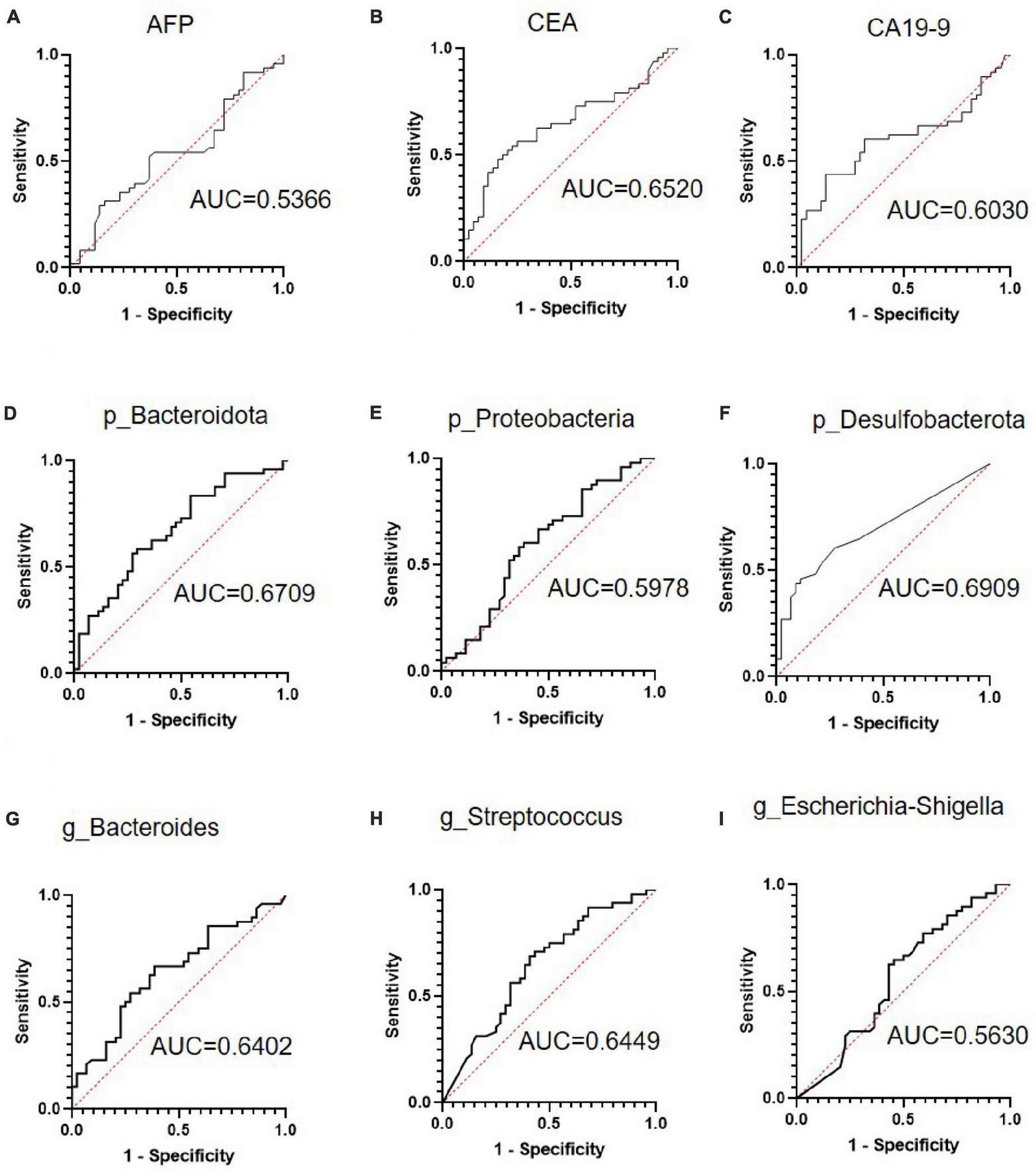 The receiver operating characteristic (ROC) curve analysis of serum tumor markers and selected bacteria in predicting the metastasis of colorectal cancer (CRC). (A–C) ROC curve analysis of serum tumor markers alpha fetoprotein (AFP), carcinoembryonic antigen (CEA), and carbohydrate antigen 19-9 (CA19-9) in patients with CRC. (D–F) ROC curve analyses of Bacteroidota, Proteobacteria, and Desulfobacterota phyla in patients with CRC. (G–I) ROC curve analysis of the Bacteroides, Streptococcus, and Escherichia-Shigella genera in patients with CRC.
