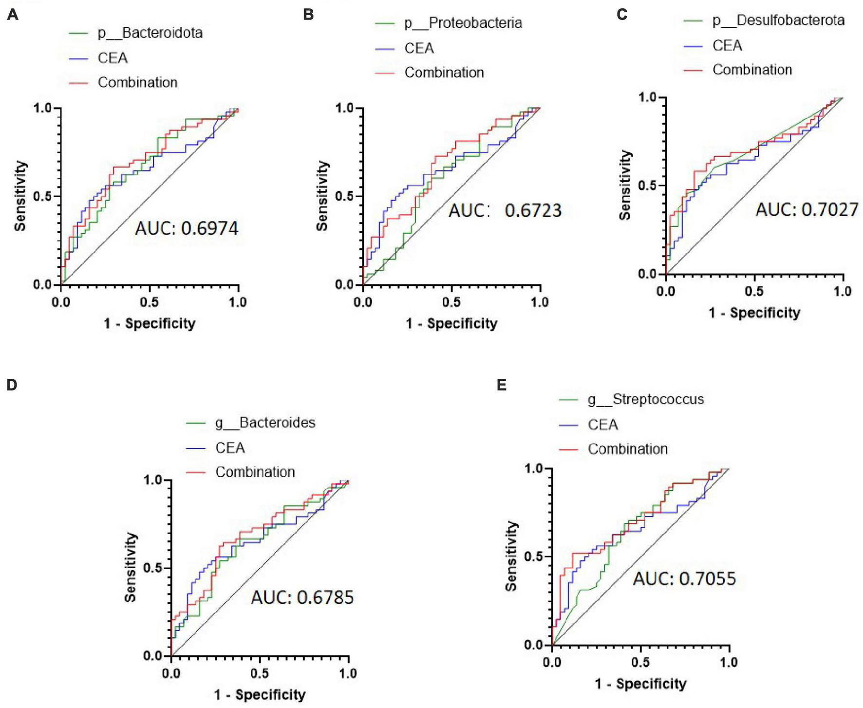 Receiver operating characteristic (ROC) curve analysis of carcinoembryonic antigen (CEA) combined with selected bacteria in predicting the metastasis of colorectal cancer (CRC). (A–C) ROC curve analysis of CEA combined with patients with Bacteroidota, Proteobacteria, and Desulfobacterota phyla. (D,E) ROC curve analysis of CEA combined with patients with the Bacteroides and Streptococcus genera.