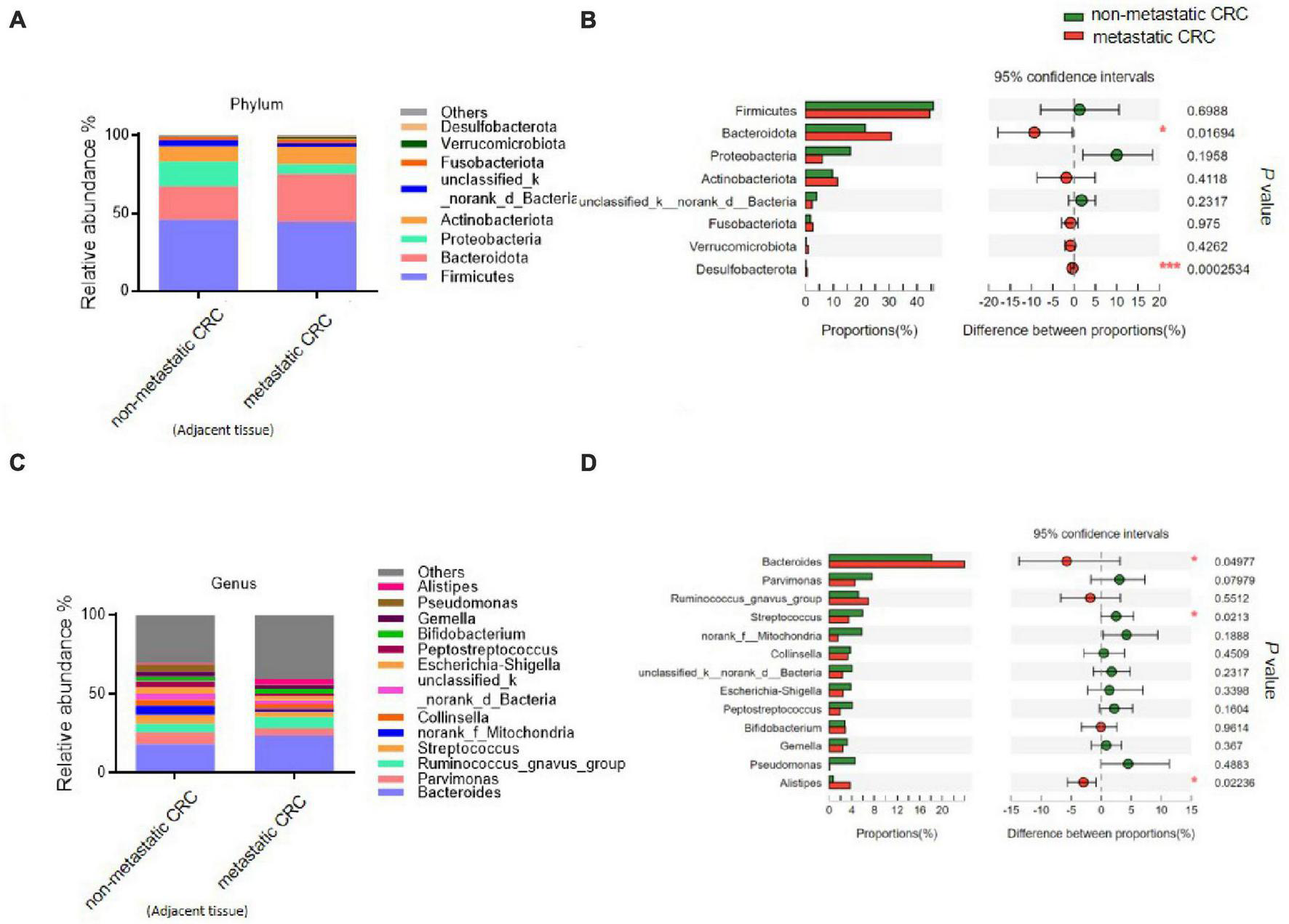 The α- or β-diversity of microbial community between the metastatic and non-metastatic CRC groups did not exhibit significant differences. However, some bacterial abundances between two groups showed significant differences. At the phylum level, Bacteroidota and Desulfobacterota were significantly higher in the metastatic group than in the non-metastatic group, while Proteobacteria was significantly decreased in the metastatic group. At the genus level, Bacteroides (mainly composed of Bacteroides fragilis and Bacteroides uniformis) was significantly higher in the metastatic group than in the non-metastatic group, while Streptococcus and Escherichia-Shigella were significantly decreased. The ROC curves of the selected bacteria showed area under the curve (AUC) values ranging from 0.598 to 0.69; when CEA and the selected bacteria were combined, the AUC values increased from 0.678 to 0.705. In addition, the bacterial composition of tumor-adjacent tissues from the metastatic and non-metastatic CRC groups were also different, and the differential bacteria were consistent with those between metastatic and non-metastatic CRC tumor tissues.