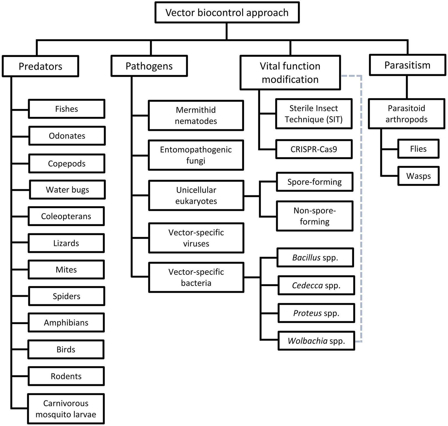 Figure 2. Different groups of vector biocontrol approach. Gray dotted lines reflect the characteristics of the Wolbachia method that combines the features of biocontrol approaches mediated by pathogens and vital function modification.