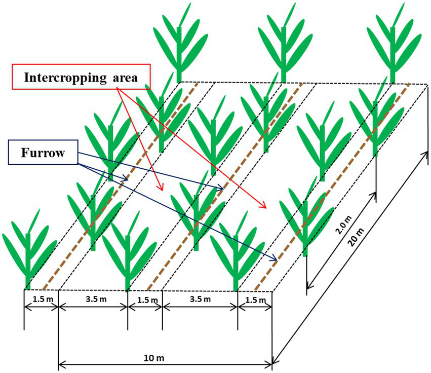 Diagram showing the 3.5 m intercropping area and 1.5 m furrow containing the banana plants within an individual plot.