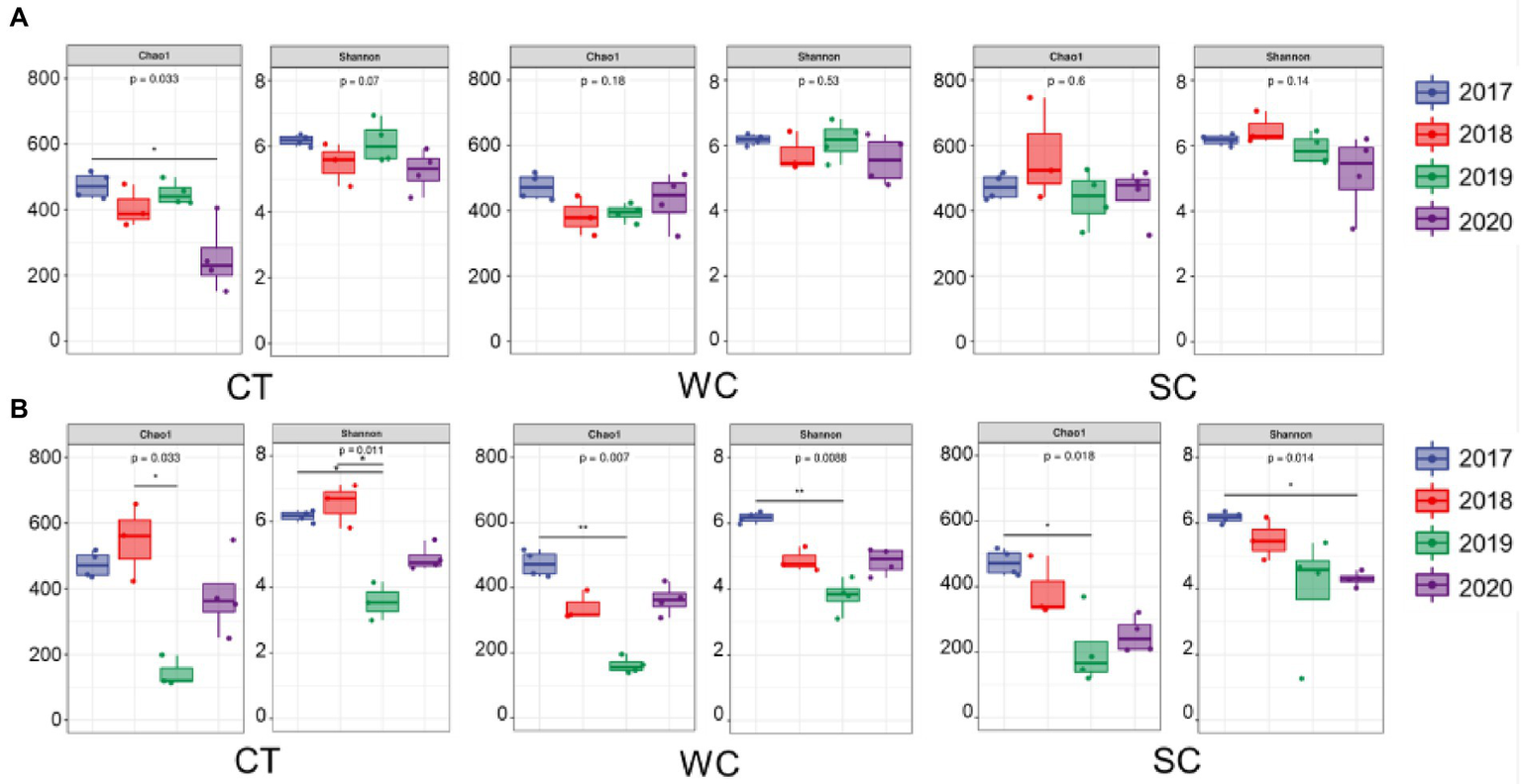 For the intercropping area with CT treatment, the Chao1 diversity index of soil fungi showed significantly less diversity after planting in 2020 compared to before planting in 2017, and the Shannon diversity index showed lower diversity in 2018 and 2020 compared to 2017 (Figure 2A). With WC treatment, there was significantly less diversity compared to 2017 in 2018 and 2019 with the Chao1 index and 2018 with the Shannon index. With SC treatment, there was only a significant difference in diversity between 2017 and 2020 with the Shannon index. Thus, soil fungal diversity in the intercropping area was generally least reduced with the SC treatment and most reduced with the CT treatment. A comparison between years showed that no treatment resulted in significant differences in soil fungal diversity in the intercropping areas (Supplementary Figure S1).