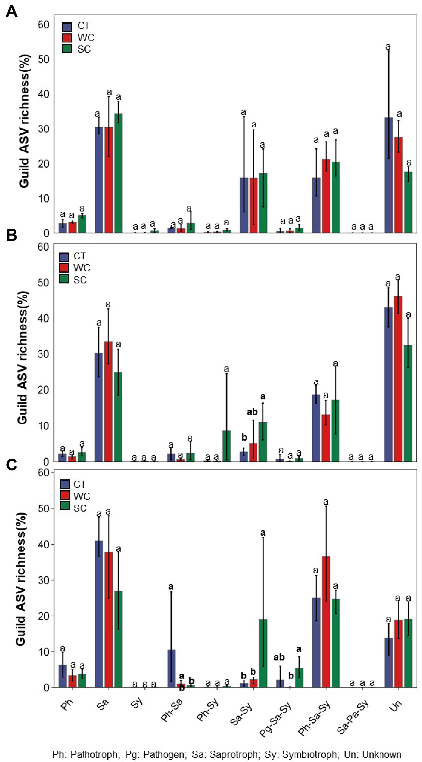 Funguild predictions of functional fungal guild ASV richness of the conventional tillage (CT), weed cover (WC) and Siratro cover (SC) treatments in the intercropping area in 2018 (A), 2019 (B) and 2020 (C). Means within the same year followed by the same letters are not significantly different at p = 0.05 according to a protected LSD test.