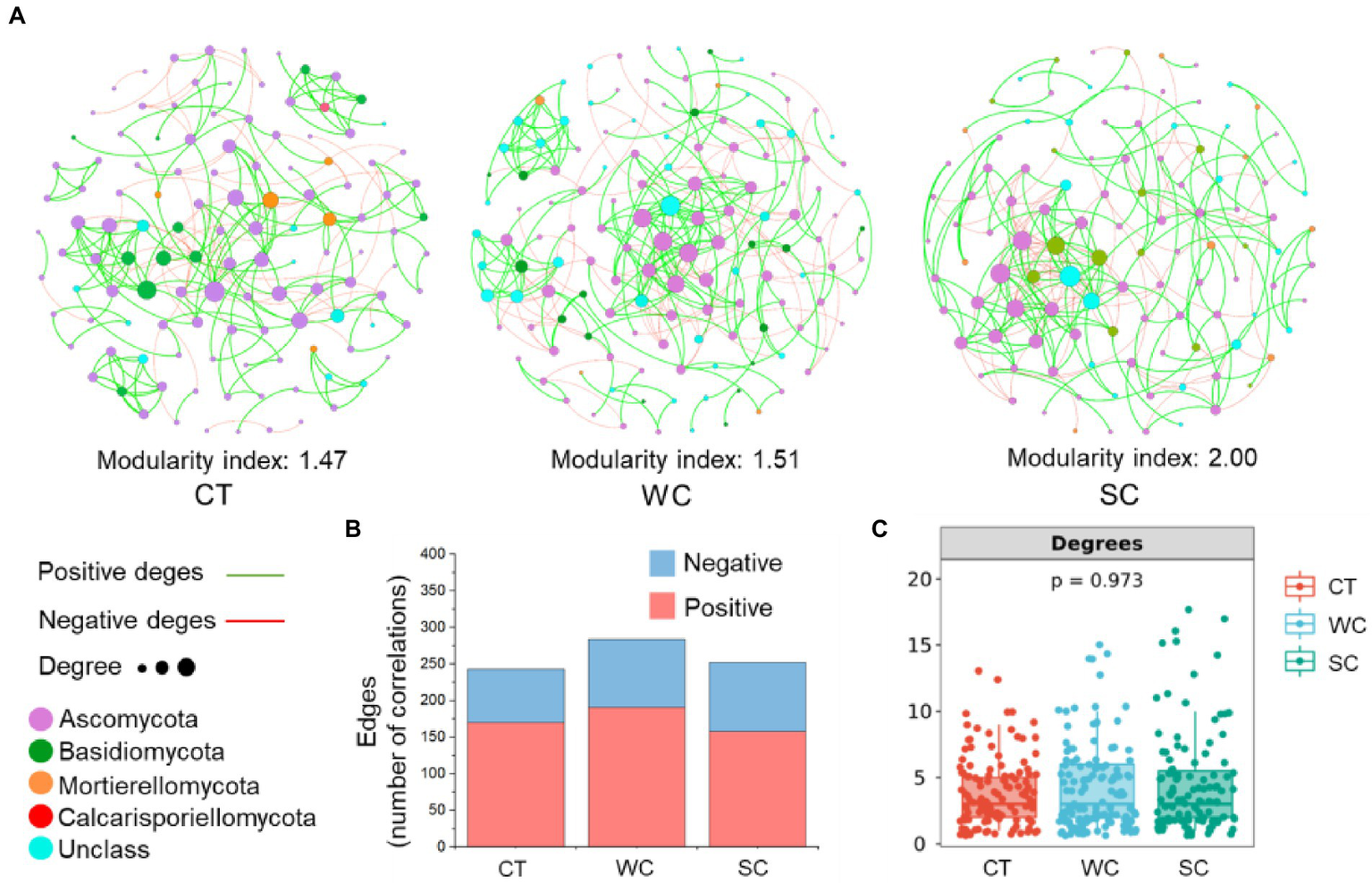 Co-occurrence networks with the conventional tillage (CT), weed cover (WC) and Siratro cover (SC) treatments in intercropping area. Modularity index and co-occurrence networks at the fungal phylum level in 2019 and 2020 (A). Number of positive and negative edges of two co-occurrences (B). Degrees of co-occurrences (C).
