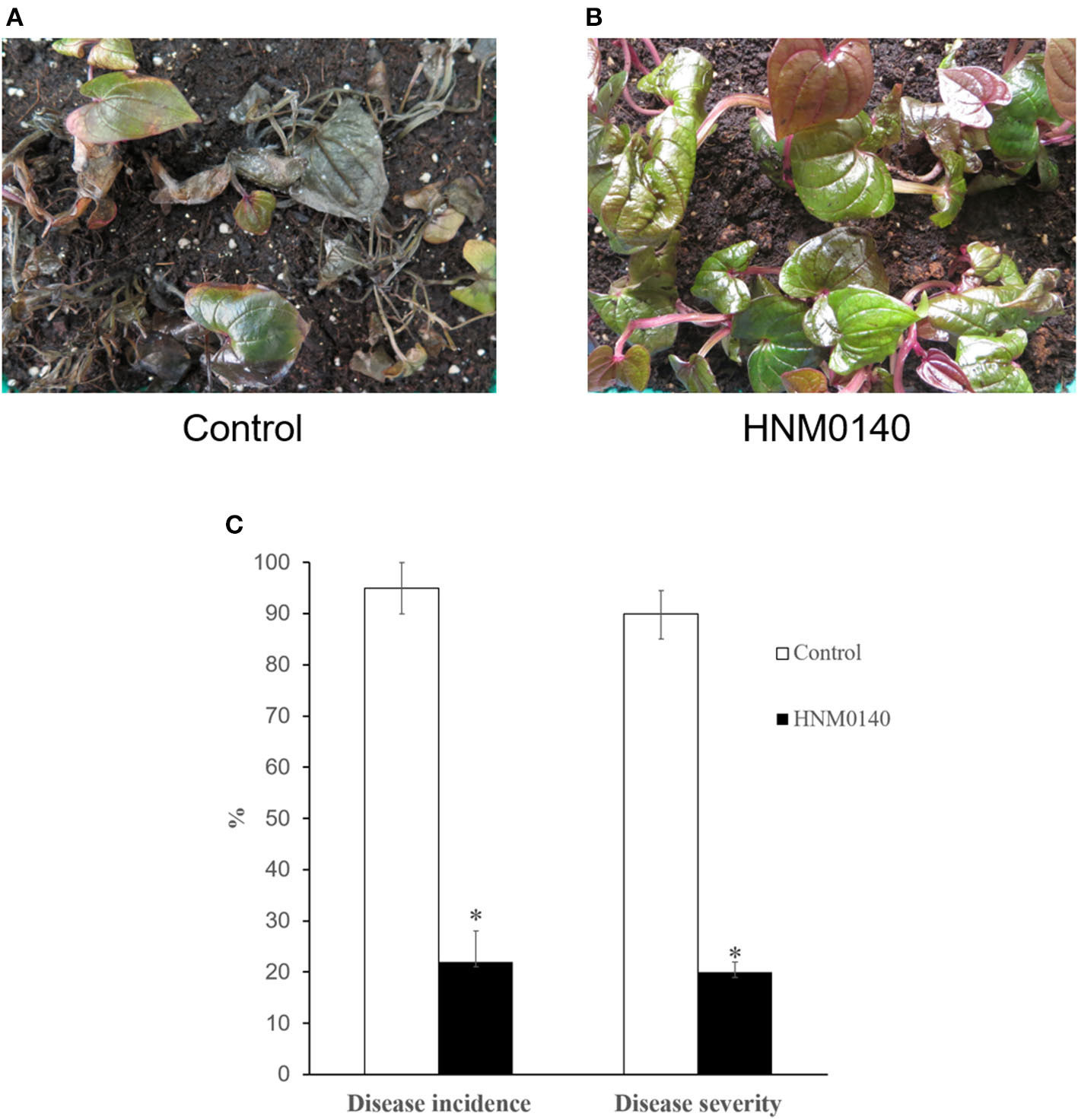 Effect of strain HNM0140Ton yam anthracnose under greenhouse conditions. (A) Anthracnose symptoms on non-treated yam plants 14 days after inoculation with C. gloeosporioides. (B) Anthracnose symptoms on treated yam plants 14 days after inoculation with C. gloeosporioides. (C) Differences in disease incidence and severity of anthracnose of the treatment relative to the non-treated plants. Asterisk indicates significance in treated than in the non-treated category according to Fisher's protected LSD test at P = 0.05.