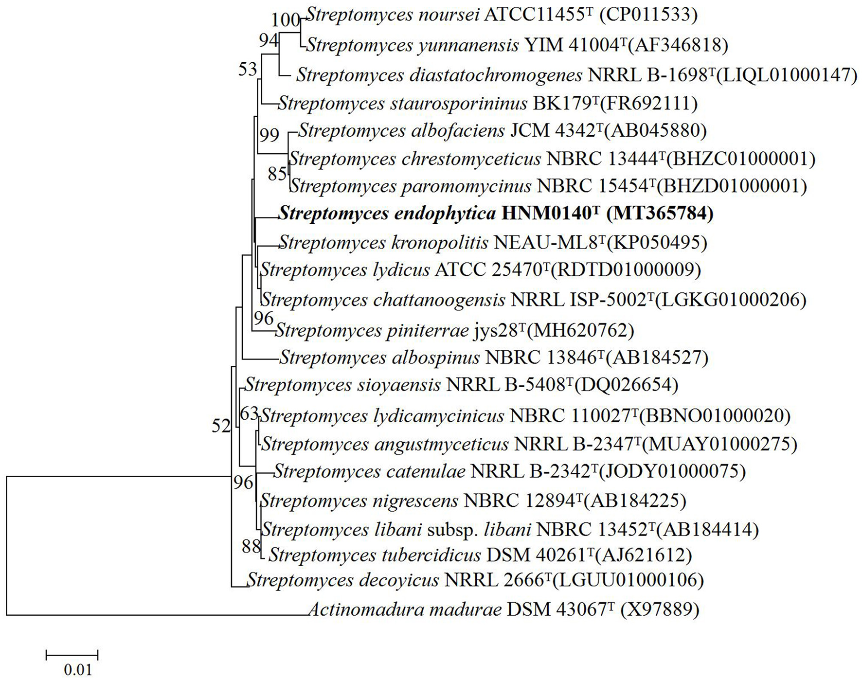 Neighbor-joining phylogenetic tree of strain HNM0140T based on 16S rRNA gene sequences. The bootstrap values (%) presented at the branches were calculated from 1,000 replications, only values >50% are given. Scale bar indicates 0.01 substitutions per nucleotide position.