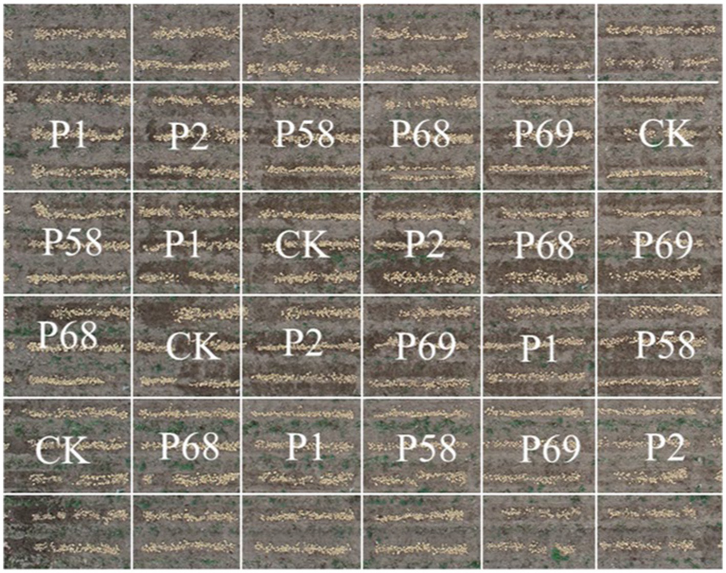 Strains of with P-solubilizing ability were isolated from the soybean rhizosphere soil at the South China Agricultural University farm (23° 08′N 113° 16′E), and those strains with better growth-promoting ability being conserved. After 7 days of incubation in NBRIP medium, the strains P1, P2, P58, P68, and P69 had higher P-solubilizing ability, and P-solubilizing capacity of 392.56, 296.77, 371.16, 461.86, and 634.57 mg·L−1, respectively. Morphological observation of these strains was carried out on LB medium after 24 h of growth. The strain was observed under microscopy as gram-positive, spore-producing bacteria with rod-shaped cells (Supplementary Figure S1).