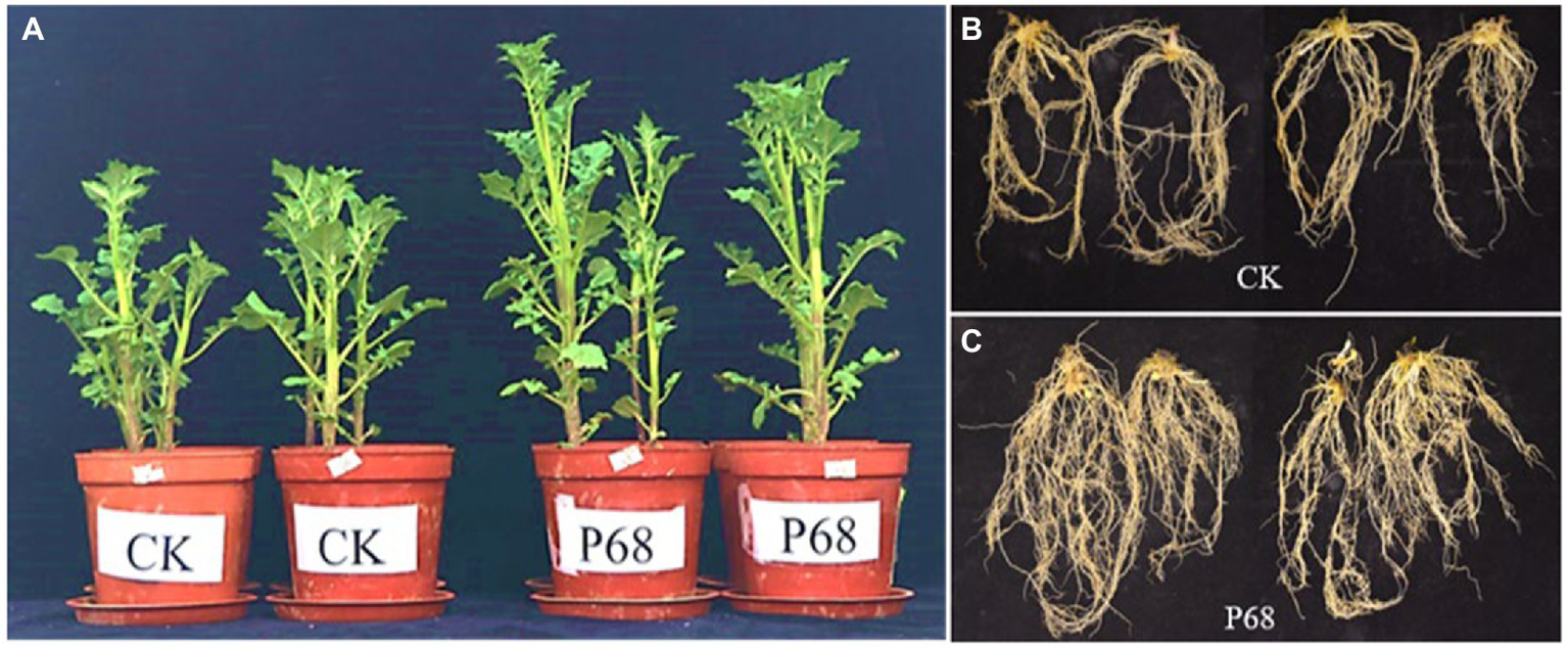 Promoting effect of P68 on potato plants in pot experiment. (A) Compared with CK, P68 significantly promoted plant growth on the 30 days after planting. (B) Roots of plants in CK treatment group. (C) Roots of plants in P68 treatment group.