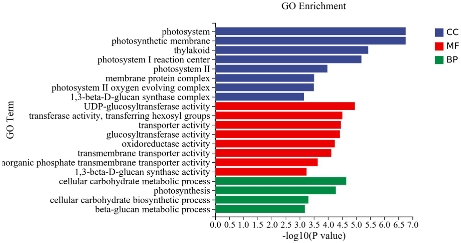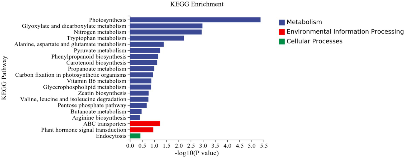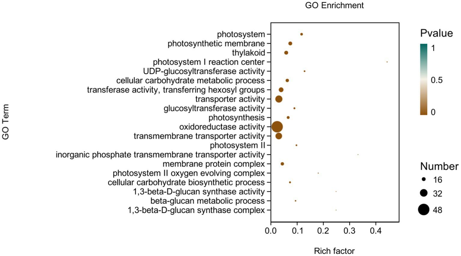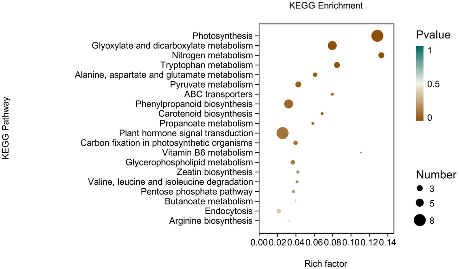 All the genes were mapped to Terms in the Gene Ontology (GO) database and the number of differentially enriched genes was calculated in each Term. TopGO (2.40.0) was used to perform GO enrichment analysis on the differential genes, and p was calculated by the hypergeometric distribution method (the standard of significant enrichment is p < 0.05), and the GO term with significantly enriched differential genes was found to determine the main biological functions performed by differential genes. ClusterProfiler (3.16.1) software was used to carry out the enrichment analysis of the Kyoto Encyclopedia of Genes and Genomes (KEGG) pathway of differential genes, focusing on the significant enrichment pathway with p < 0.05.