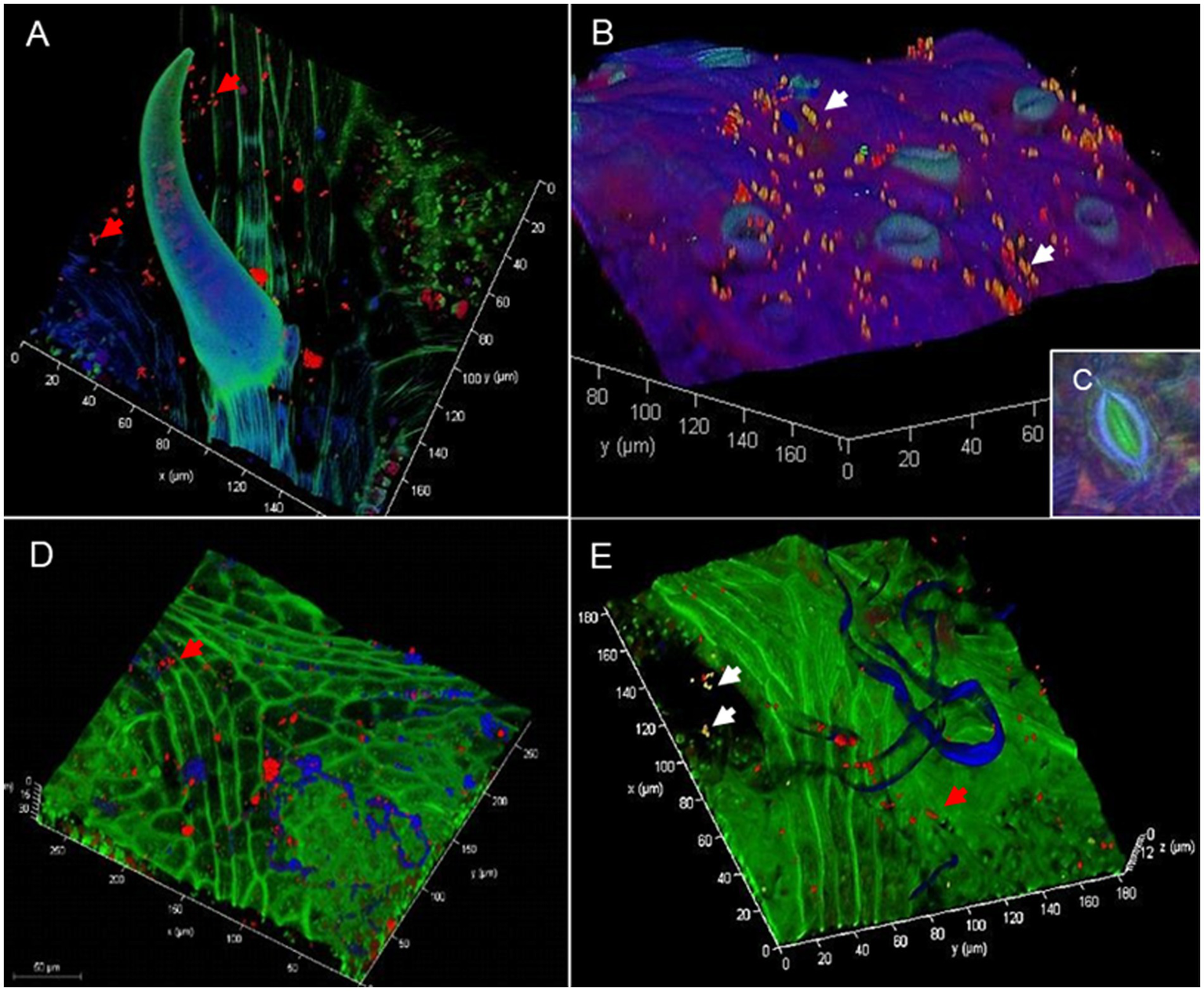Confocal laser scanning microscopy (CLSM) micrograph in combination with fluorescence in situ hybridization showing bacterial colonization on grapevine phyllosphere. Confocal laser scanning micrographs of Vitis riparia leaves showing bacterial colonization patterns on nearby a trichome (A) and young, freshly emerged stomata (B) White arrows: Rhizobiales, red: other bacteria. Vitis riparia is considered to be highly resistant to P. viticola due to its inner stomatal rim (C). Confocal laser scanning micrographs of Vitis alexanderi “Isabella” leaves showing bacterial colonization of leaf hairs (D) and nearby fungal hyphae and spores present on the leaf surface (E). White arrows: Rhizobiales, red arrows: other bacteria, blue: autofluorescence of leaf hairs and fungal structures.