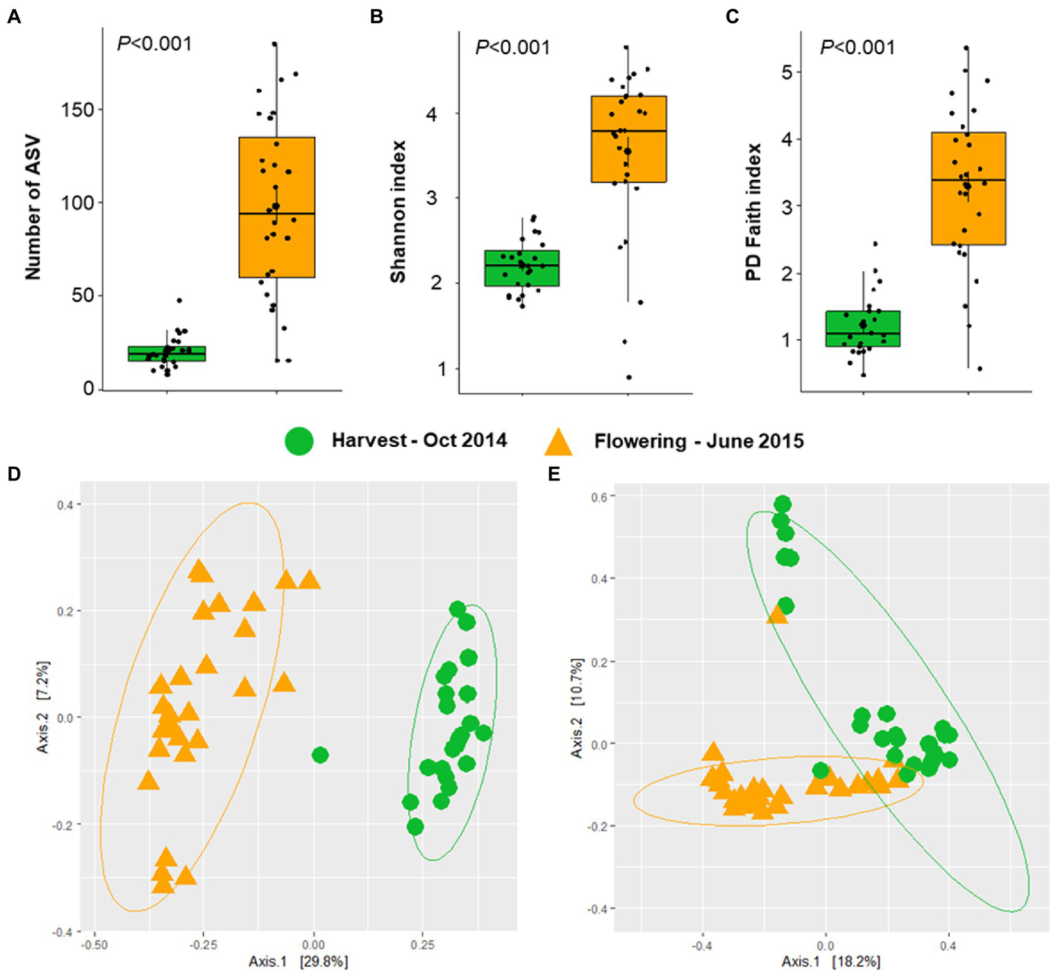 Alphaproteobacterial diversity and community structure at two phenological growth stages. Alphaproteobacterial richness and diversity were estimated based on the number of ASVs (A), Shannon index (B), and PD Faith index (C). Significances in alphaproteobacterial diversity (A–C) were determined with the Kruskal Wallis test, representing p < 0.05. Alphaproteobacterial community clustering was assessed based on Bray–Curtis (D) and weighted UniFrac (E) matrix distances and visualized PCoA plots.