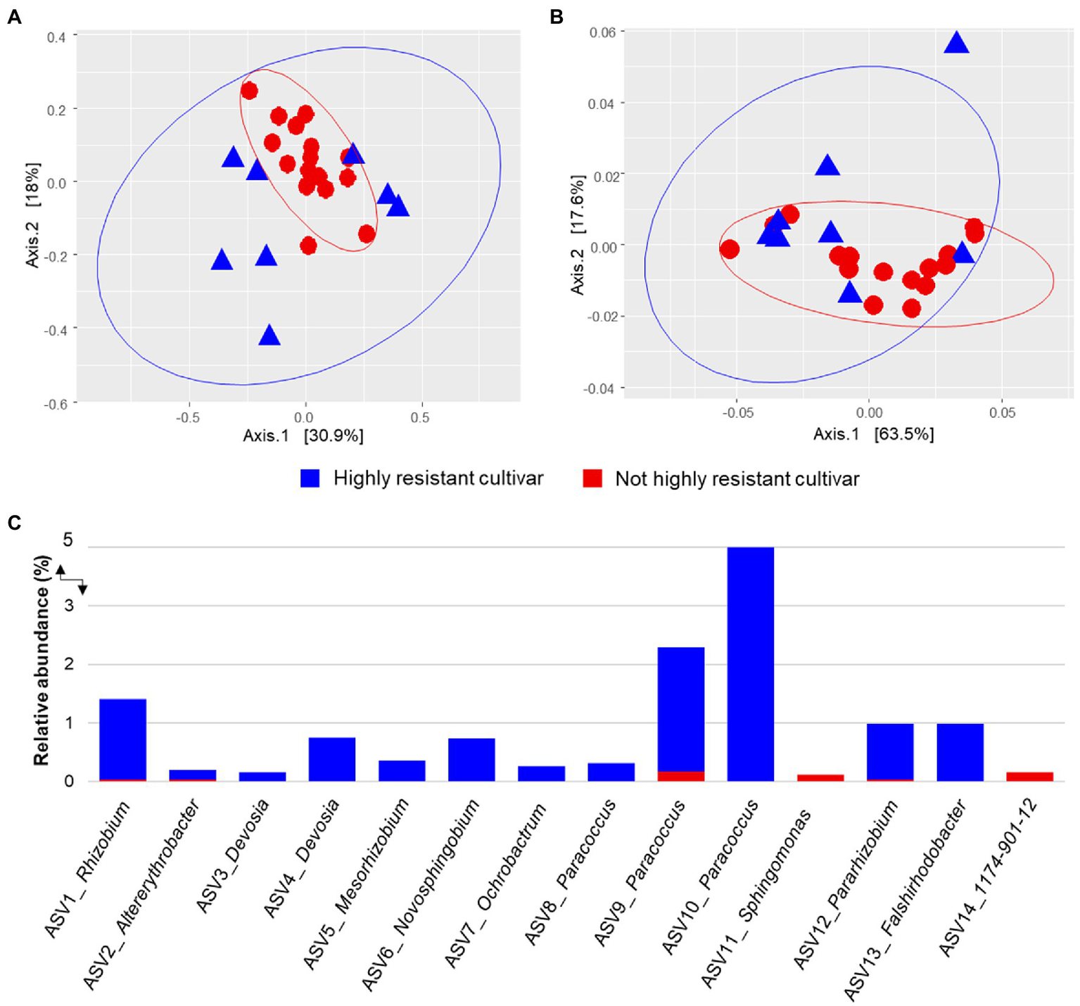 Alphaproteobacterial community structure of grapevine cultivars with different resistance (highly resistant, i.e., V. amurensis Rupr and V. riparia L. vs not highly resistant, i.e., Vitis vinifera L. subsp. Sylvestris, Vitis vinifera L. subsp. vinifera “Blauer Wildbacher,” Vitis × alexanderi Prince ex Jacques “Isabella,” and Vitis vinifera L. subsp. vinifera “Müller Thurgau”) traits against Plasmopara viticola. Alphaproteobacterial community clustering was assessed based on Bray–Curtis (A) and weighted UniFrac (B) matrix distances and visualized PCoA plots. Alphaproteobacterial ASVs that were differentially abundant between highly resistant cultivars (blue bars) and not highly resistant cultivar samples (red bars) according to edgeR analysis (C).