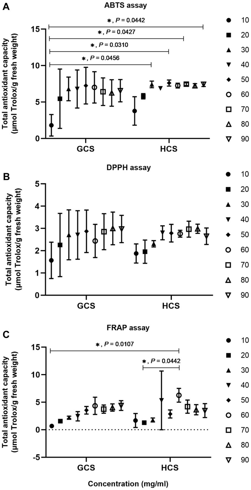 According to the tissue mass (g): the volume of extraction liquid (mL) was 1:5–10 (about 0.1 g tissue was weighed and 1 mL of extraction liquid was added), ice bath homogenization was carried out, then 10,000 g tissue was centrifuged at 4°C for 10 min, the supernatant was taken. The supernatant was successively diluted to 10, 20, 30, 40, 50, 60, 70, 80, and 90 mg/mL and placed on ice for testing. Biology was repeated 3 times for each group of samples. The ABTS, DPPH, and FRAP kits used in this study were purchased from Suzhou Keming Biotechnology Co., LTD (Wang et al., 2022).