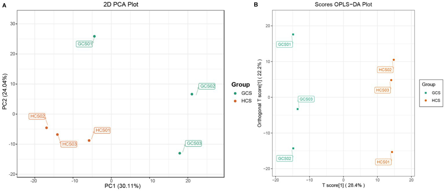 The information about the samples’ metabolome. The color of the points stands for the sample’s two groups. (A) PCA scores plot of the fleshy stems’ two ecotypes. PC1 stands for the first principal component, PC2 stands for the second principal component, and the interpretation rate of this principal component to the data set is expressed as a percentage. (B) OPLS-DA score plot of two ecotypes of the fleshy stems.