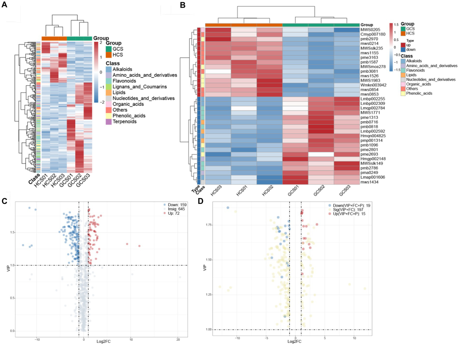 The changes in the differential metabolites. (A,B) The horizontal coordinate denotes diverse groups, the vertical coordinate denotes the metabolites, and the colored blocks at diverse locations denote the relative quantity of metabolites. (A) Heatmap of distinct metabolites. The metabolites for which VIP > 1 and FC ≥ 2, FC ≤ 0.5 were considered to be significantly changed. (B) Heatmap of key differential metabolites. Metabolite patterns were detected in two clusters. The metabolites for which VIP > 1, FC ≥ 2, FC ≤ 0.5, and p < 0.05 were deemed to be crux prominently variation. (C,D) Red represented the up-regulation of expression, blue represented the downregulation of expression, gray represented the insignificant of expression, and yellow represented the significance of expression. (C) The volcanic plot of differential metabolites. The metabolites for which VIP > 1 and FC ≥ 2, FC ≤ 0.5 were considered to be significantly changed. (D) The volcanic plot of key differential metabolites. The metabolites for which VIP > 1, FC ≥ 2, FC ≤ 0.5, and p < 0.05 were deemed to be crux prominently variation.