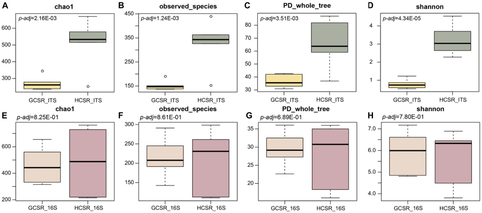 The microbiome communities’ α diversity in distinct sites (p < 0.05, ANOVA, Tukey-HSD test). (A–D) Results of fungi’s α diversity index. (E–H) Results of bacteria’s α diversity index. The box chart primarily involves 5 data nodes and arranges a set of data from largest to smallest to compute its upper edge, upper quartile, median, lower quartile, and lower edge, respectively.