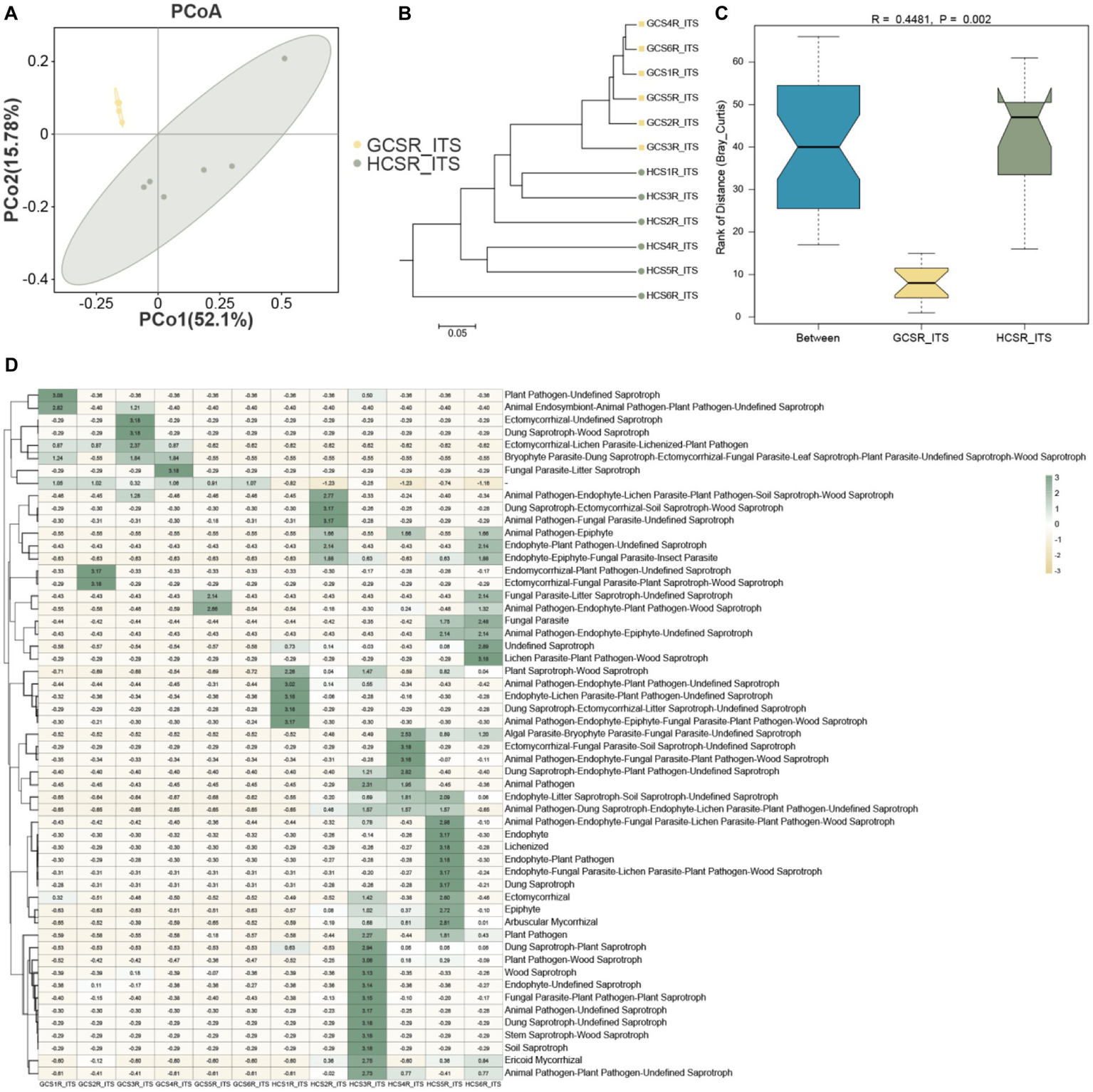 Endophytic fungal community diversity’s analysis in fleshy stems. (A) At the OTU level, the fungal community’s PCoA is on the strength of the bray Curtis. (B) UPGMA hierarchical clustering of fungi. Based on the bray Curtis, UPGMA hierarchical clustering was performed for two ecotypes. The closer the sample is, the shorter the length of the branches, showing that the two ecotypes’ species composition is more alike and can be brought together. (C)β distance data for fungi, based on the bray Curtis. (D) Heat map of fungal functional group (guilds).