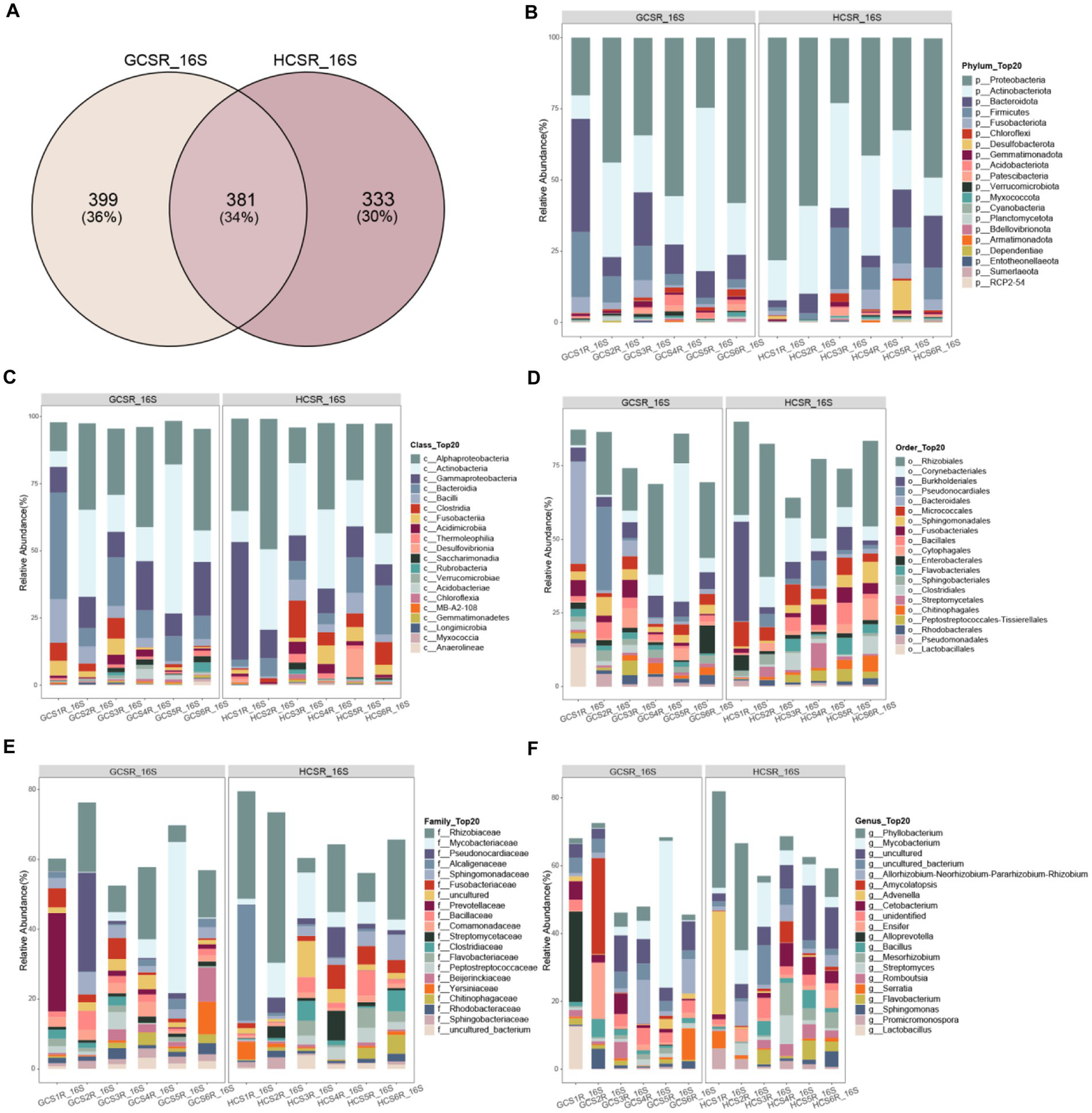 Distribution of bacterial species at different classification levels. The Venn diagram counted the number of bacterial OTUs at two ecotypes, which could intuitively show the overlaps between groups and the number of bacterial OTUs unique to each group. Selected bacterial species with an abundance top 20 are shown in the figure and the void is the sum of the other bacterial species. (A) Venn Diagram of overlap of bacterial OTUs between groups. (B) At the phylum level the bacteria’s relative abundance. (C) At the class level the bacteria’s relative abundance. (D) At the order level the bacteria’s relative abundance. (E) At the family level the bacteria’s relative abundance. (F) At the genus level the bacteria’s relative abundance.