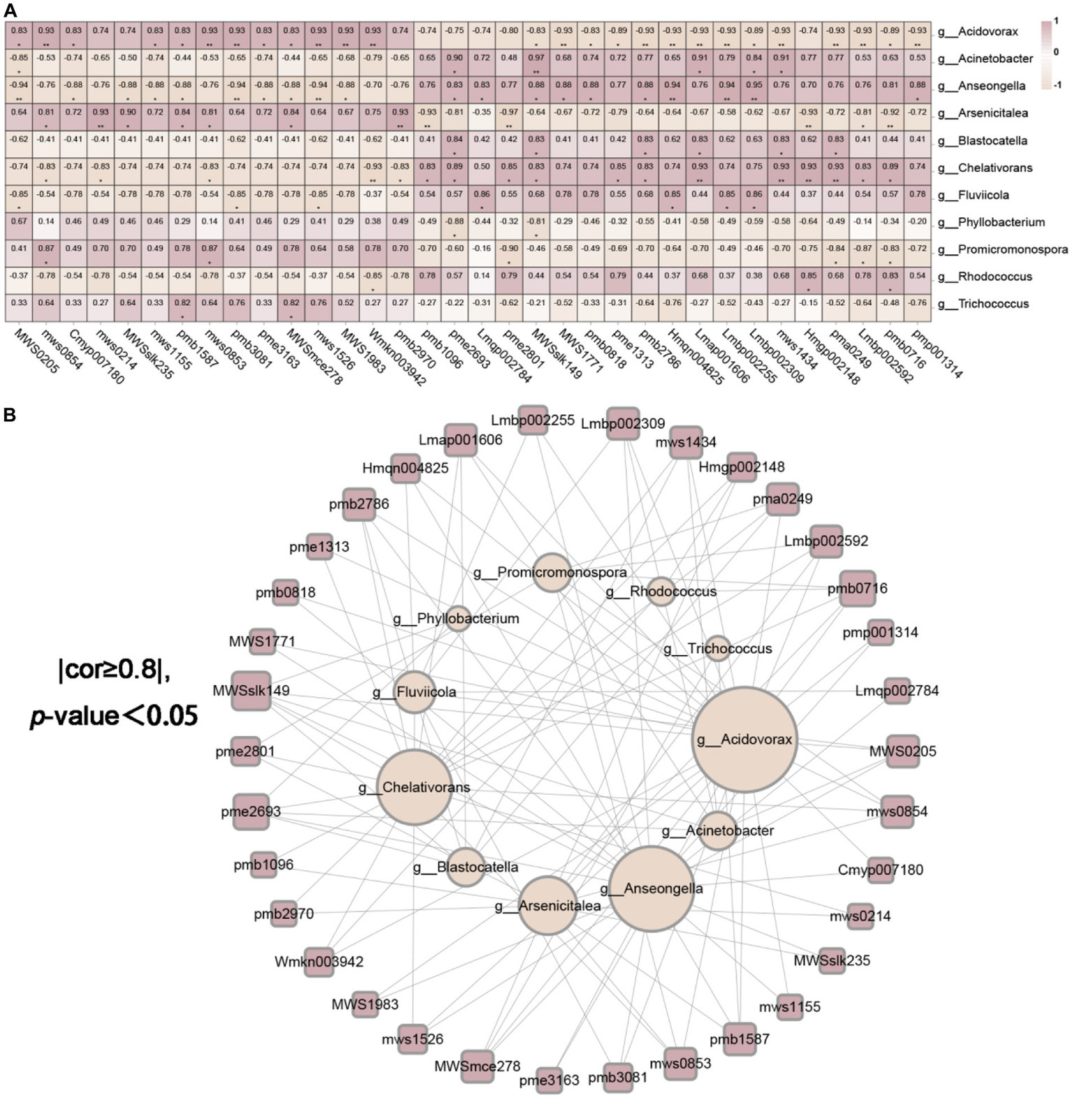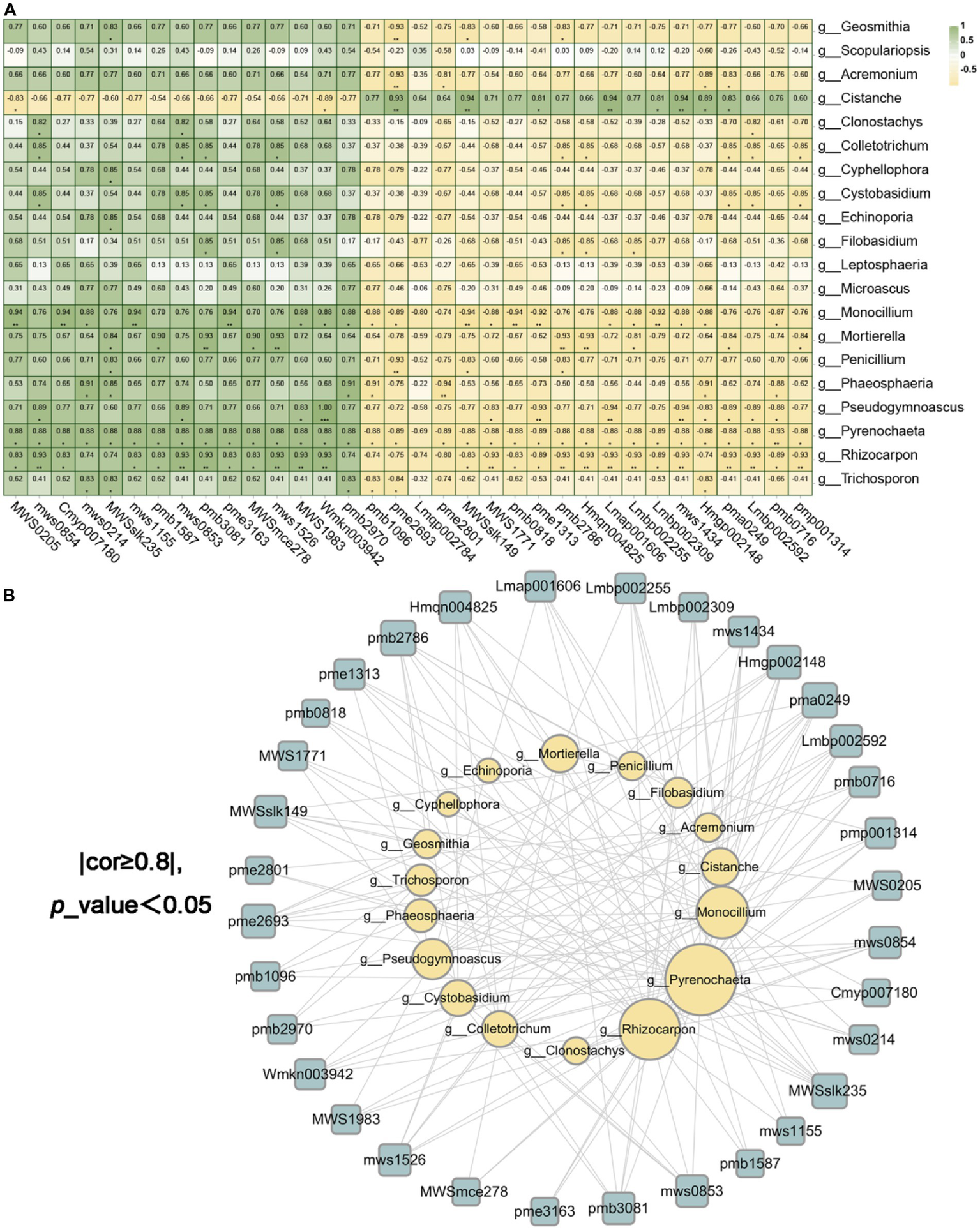 The LEfSe method was brought to analyze biomarkers with statistical discrepancies. The Spearman algorithm was brought to analyze the relevance between fungi and bacteria screened at the genus level and identified core differential metabolites, and the results were represented by a heat map. The results with a p-value of less than 0.05 and a correlation of more than 0.8 should be more clearly and obviously visualized by Cytoscape software (Sun et al., 2020a; Miao et al., 2023).