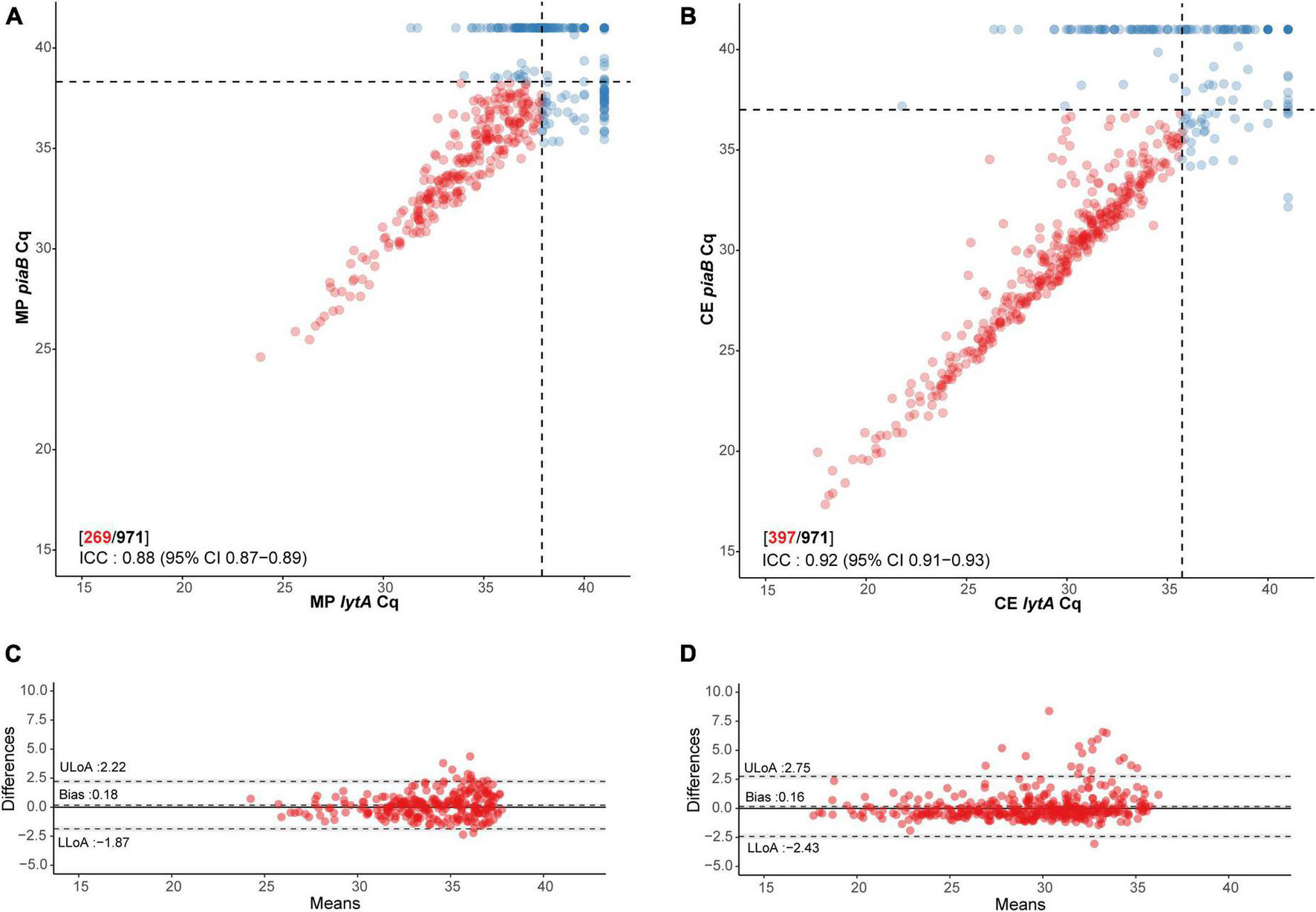 Scatter plot illustrating extent of agreement between piaB and lytA in (A) minimally processed and (B) culture-enriched saliva samples and BlandâAltman plots (C,D, respectively) displaying extent of agreement and bias among samples with Cqs < 40 for piaB and lytA. Dots colored in red depict samples with Cqs < 40 for piaB and lytA, remaining samples are colored in blue. Black dashed lines in scatter plots indicate data-driven thresholds. In BlandâAltman plots black dashed lines indicate the upper (ULoA) and lower limit of agreement (LLoA) and mean difference (bias). Shaded areas indicate 95% confidence interval. The solid black line indicates the line of equality (no bias).