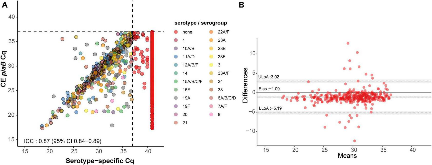 Scatter plot (A) illustrating extent of agreement between piaB and serotype/serogroup-specific detection among culture-enriched saliva samples (n = 353) and BlandâAltman plot (B) displaying extent of agreement and bias among samples with Cqs < ROCdCq for piaB and serotype/serogroup-specific qPCR assays. In panel (A), saliva samples are colored by serotype/serogroup-specific signal detected. Samples classified as negative for any of the tested serotype/serogroup-specific qPCR assays are colored in red. Black dashed lines indicate data-driven ROCdCq thresholds. In panel (B) (BlandâAltman plot) the degree of agreement between piaB and lytA Cq measurements among positive samples is shown. The mean difference in measurements is indicated by a dashed gray line and the standard deviations of the mean, upper limit of agreement (ULoA) and lower limit of agreement (LLoA) are also shown. Shaded areas indicate the 95% confidence interval. The solid black line indicates the line of equality (no bias) and dots above this line are for samples of which lytA Cqs where lower than piaB Cqs. ICC values <0.50, 0.50â0.75, 0.75â0.90, and â„0.90 are indicative of poor, moderate, good, and quantitative agreement, respectively.