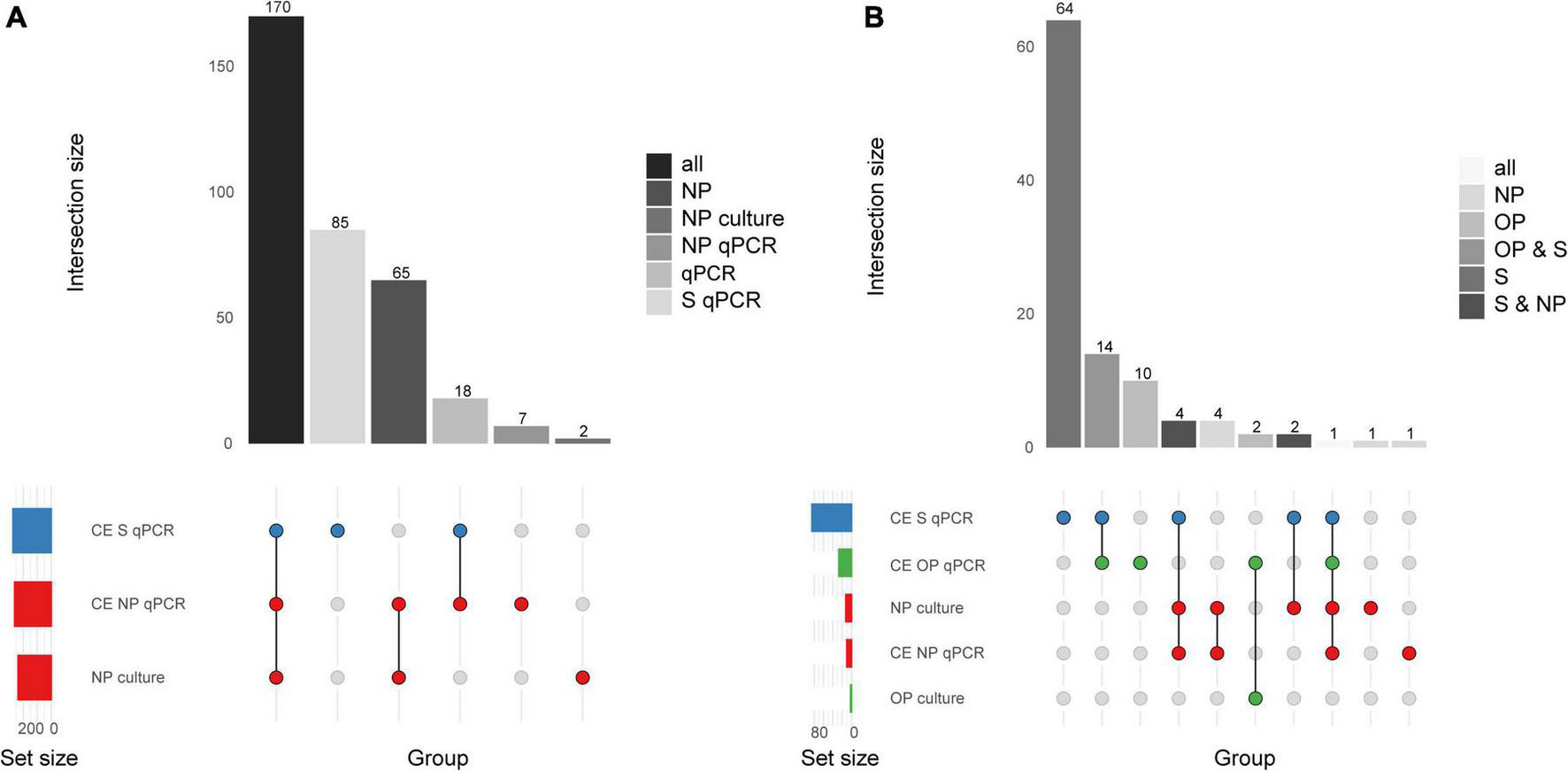 Quantitative PCR-based detection of Streptococcus pneumoniae among saliva and nasopharyngeal (NP) samples from (A) young children (n = 653) and (B) qPCR-based detection of S. pneumoniae among saliva (S), nasopharyngeal (NP), and oropharyngeal (OP) from adults (n = 318). The intersection bar diagrams display the total number of individuals positive per intersection. The matrix diagram displays intersection components (method or criterion). The set size bar diagram displays the total number of individuals positive per intersection component. Saliva, oropharyngeal, and nasopharyngeal samples are colored blue, green, and red, respectively, in the matrix diagram. âMPâ stands for minimally processed, âCEâ stands for culture-enrichment. âqPCRâ stands for samples identified as positive for pneumococcus according with molecular method of qPCR and applying study criteria for positivity. âCultureâ stands for isolation of viable S. pneumoniae from either primary diagnostic, or qPCR-guided culture.