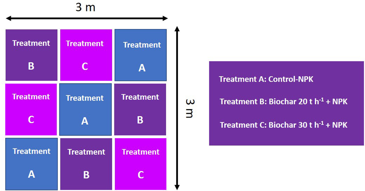 The study was carried out in nine plots, with an area of 1 m2 each in the year 2015. Three replicates of randomly arranged blocks received three types of treatment. In treatment A, three plots received only NPK fertilizer (control, commercially available NPK fertilizer, i.e., N:P2O5:K2O, 40-40-50 kg ha−1, respectively, recommended doses were calculated manually), another three plots under treatment B received the same dose of NPK and 20 tons ha−1 of biochar (5% by weight), and in treatment C, three random plots received the same dose of NPK along with 30 tons ha−1 of biochar (10% by weight), as explained in Figure 1. Biochar was added to the top 15 cm of soil and was mixed thoroughly, and soils were irrigated with saline water containing various ions (Na+, Ca2+/Mg2+, K+, HCO3−, and Cl in a concentration of 28, 10, 0.79, 1.2, and 35.6 meq L−1, respectively) via drip irrigation system (Gill et al., 2020). Physicochemical properties, such as electrical conductivity, soluble magnesium, calcium, chloride, potassium, and sodium content, were monitored constantly.