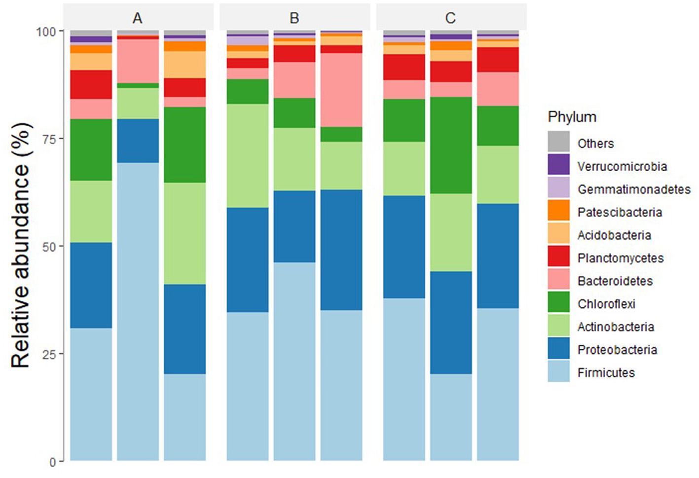 Relative abundance of major bacterial phyla in treatments (A–C), receiving 0, 20, and 30 tons ha−1 of biochar with NPK. Microbial communities in all three treatments were analyzed in triplicates.