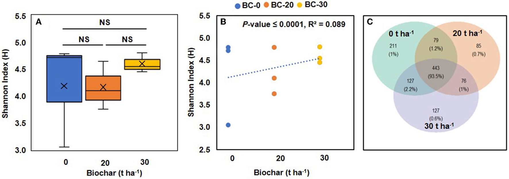 Boxplots illustrating alpha diversity (Shannon index) in bacterial microbiomes of treatments with different concentrations of biochar (A). (B) Shows a correlation between the Shannon diversity index and increasing dose of Biochar. A positive correlation between bacterial diversity and increasing concentration of biochar was observed supported by a significant p-value. (C) Venn diagram showing the numbers of bacterial genera shared by treatments with different biochar concentrations. NS, not significant.