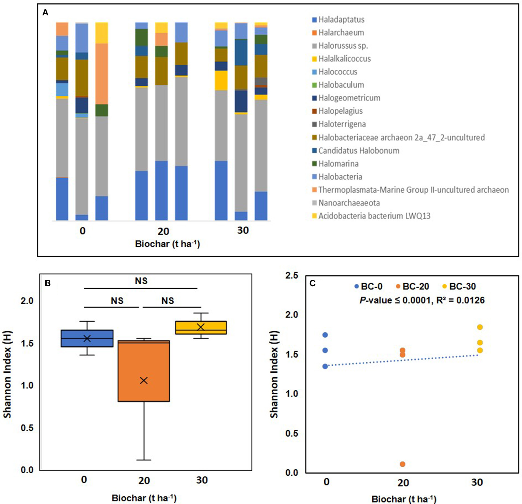 Relative abundance of archaeal genera in the biochar-treated and untreated soil samples in triplicates. (A) Shows the relative abundance of different archaea genera in the three treatments. (B) Shows a box plot of the alpha diversity of the archaea communities in the three treatments. Where means of observed Shannon index their median (lines in the boxes), and lowest and highest values are plotted. (C) Shows a correlation between the Shannon diversity index and increasing dose of Biochar. A positive correlation between bacterial diversity and increasing concentration of biochar was observed and supported by a significant p-value. NS, not significant.