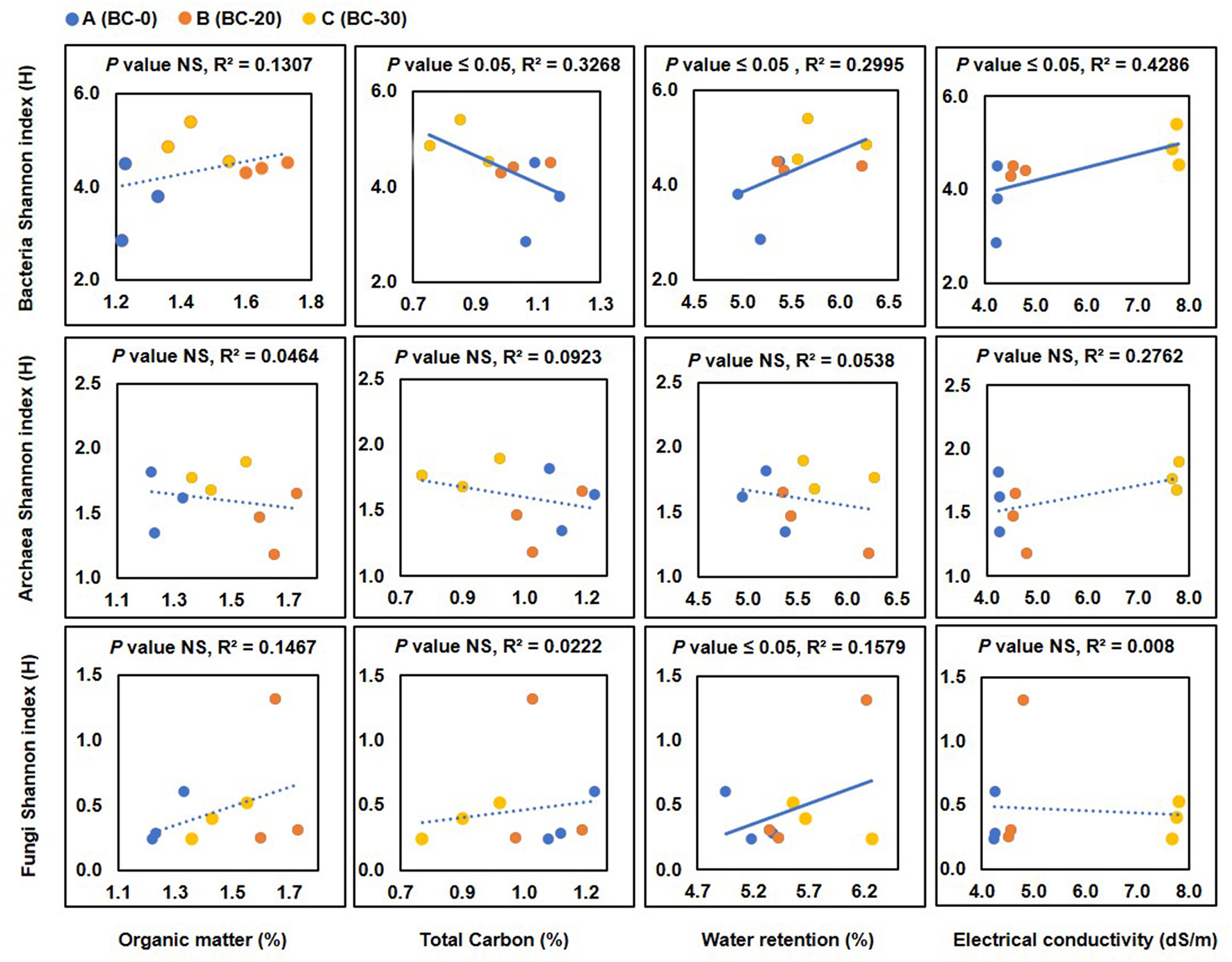 Correlation of bacterial, archaeal, and fungal diversity in terms of Shannon index with changes in organic matter (OM), total carbon (TC), water retention (WR), and electrical conductivity (EC) following treatment with various concentrations of biochar, (A) control, (B) 20 t ha−1 and (C) 30 t ha−1. Values of the parameters are plotted on the x-axis and values of the Shannon index are plotted on the y-axis. NS, not significant. Significant values are marked with a solid line, while insignificant values are shown as dotted lines.