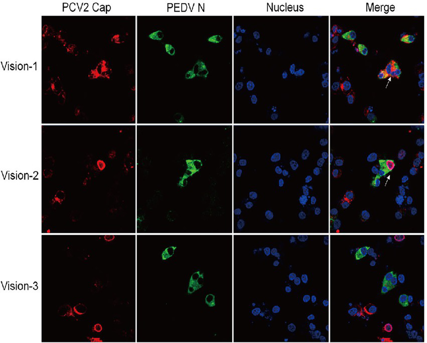 IPI-FX cells support the replication of both PEDV and PCV2 together. IPI-FX cells were inoculated with both PEDV and PCV2d-LNHC. At 72 h after inoculation, the cells were fixed, stained with an immunofluorescence assay (IFA), and observed with laser confocal microscopy. White arrows indicate cells infected with PEDV and PCV2.