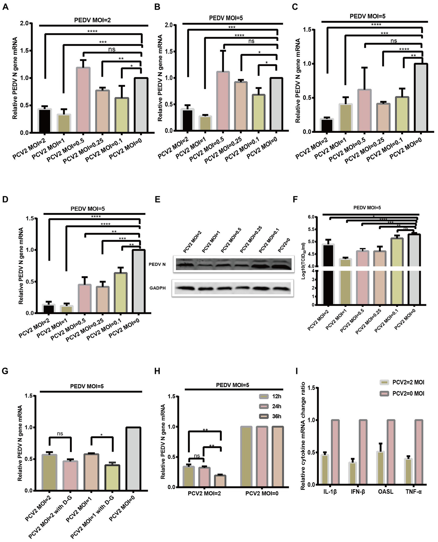 PCV2 reduces PEDV replication in IPI-FX cells. IPI-FX cells were inoculated PCV2d-LNHC at MOI = 2, 1, 0.5, 0.25, or 0.1 and incubated for 24 h. The same cells were then inoculated with PEDV (MOI = 2 or 5) and incubated for another 24 h. The cells were collected, the total RNA extracted, and the relative expression levels of nucleocapsid (N) mRNA in the PEDV–PCV2 dual-infected or PEDV-infected cells determined with RT–qPCR (A,B). IPI-FX cells were inoculated PCV2a-LG or PCV2b-MDJ at MOI = 2, 1, 0.5, 0.25, or 0.1 and incubated for 24 h. The same cells were then inoculated with PEDV (MOI = 5) and incubated for another 24 h. The cells were collected, the total RNA extracted, and the relative expression levels of nucleocapsid (N) mRNA in the PEDV–PCV2 dual-infected or PEDV-infected cells determined with RT–qPCR (C,D). IPI-FX cells were inoculated PCV2d-LNHC at MOI = 2, 1, 0.5, 0.25, or 0.1 and incubated for 24 h. The same cells were then inoculated with PEDV (MOI = 5) and incubated for another 24 h. After that, the cells were collected, lysed, and analyzed with western blotting using the antibodies indicated on the left. GADPH was loaded as the internal control (E). IPI-FX cells were inoculated PCV2d-LNHC at MOI = 2, 1, 0.5, 0.25, or 0.1 and incubated for 24 h. The same cells were then inoculated with PEDV (MOI = 5) and incubated for another 24 h. The cells and supernatants were freeze–thawed to obtain viral stocks. The viral titers were determined with the Reed–Muench method (F). IPI-FX cells were inoculated with PCV2d-LNHC (MOI = 2 or 1) and incubated for 24 h with or without d-glucosamine. The cells were then inoculated with PEDV (MOI = 5) and incubated for another 24 h. The cells were collected, the total RNA extracted, and the relative expression levels of nucleocapsid (N) mRNA in the PEDV–PCV2 dual-infected or PEDV-infected cells determined with RT–qPCR (G). IPI-FX cells were inoculated with PCV2d-LNHC (MOI = 2) and incubated for the indicated times, and then with PEDV (MOI = 5) and incubated for another 24 h. The cells were collected, the total RNA extracted, and the relative expression levels of nucleocapsid (N) mRNA in the PEDV–PCV2 dual-infected or PEDV-infected cells determined with RT–qPCR (H). IPI-FX cells were inoculated with PCV2d-LNHC (MOI = 2) and incubated for 24 h, and then with PEDV (MOI = 5) and incubated for another 24 h. The cells were collected, the total RNA extracted, and the relative expression levels of IL1β, IFN-β, OASL, and TNF-α mRNAs in the PEDV–PCV2 dual-infected and PEDV-infected cells determined with RT–qPCR using specific primers for IL1β, IFN-β, OASL, and TNF-α (I). GADPH mRNA was used as the internal control for normalization (A–I). Means ± standard deviations were calculated from three independent replicates of each experiments.