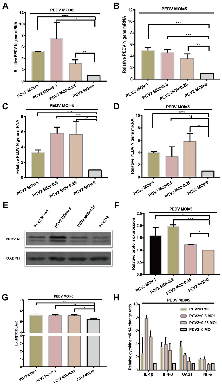 PCV2 promotes PEDV replication in IPI-FX cells. IPI-FX cells were inoculated with PEDV (MOI = 2 or 5) and simultaneously with PCV2d-LNHC (MOI = 1, 0.5, or 0.25). The cells were collected, the total RNA extracted, and the relative expression levels of nucleocapsid (N) mRNA in the PEDV–PCV2 simultaneously infected or PEDV-infected cells determined with RT–qPCR at 24 hpi (A,B). IPI-FX cells were inoculated with PEDV (MOI = 5) and simultaneously with PCV2a-LG or PCV2b-MDJ (MOI = 1, 0.5, or 0.25). The cells were collected, the total RNA extracted, and the relative expression levels of nucleocapsid (N) mRNA in the PEDV–PCV2 simultaneously infected or PEDV-infected cells determined with RT–qPCR at 24 hpi (C,D). IPI-FX cells were inoculated with PEDV (MOI = 5) and simultaneously with PCV2d-LNHC (MOI = 1, 0.5, or 0.25). At 24 hpi, the cells were collected, lysed, and analyzed with western blotting using the antibodies indicated on the left. GADPH was loaded as the internal control (E). Western blotting results were quantified with ImageJ (National Institutes of Health, Bethesda, Maryland, United States) (F). IPI-FX cells were inoculated with PEDV (MOI = 5) and simultaneously with PCV2d-LNHC (MOI = 1, 0.5, or 0.25). At 24 hpi, the cells and supernatants were freeze–thawed to obtain viral stocks. The viral titers were determined with the Reed–Muench method (G). Relative expression levels of IL1β, IFN-β, OASL, and TNF-α mRNAs in the PEDV–PCV2 simultaneously infected and PEDV-infected cells were also determined (H). GADPH mRNA was used as the internal control for normalization. Means ± standard deviations were calculated from three independent replicates of each experiment (A–H).
