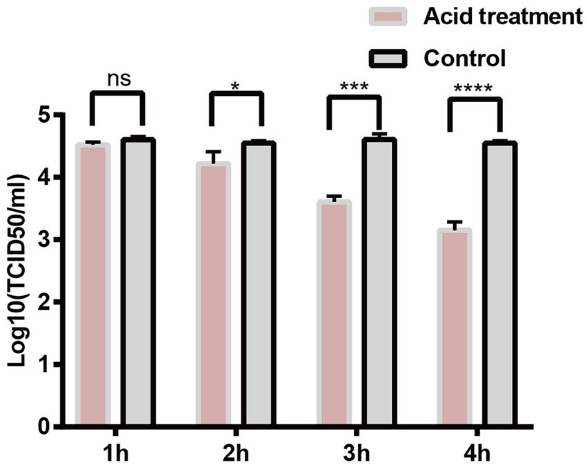 PCV2 tolerates environmental pH 2.0. PK15 cells were inoculated with PCV2d-LNHC at pH 2.0 and incubated for 1–4 h at 37°C. The viral titers in the acid-treated PCV2-infected and mock-PCV2-infected cells were determined with virus titration.