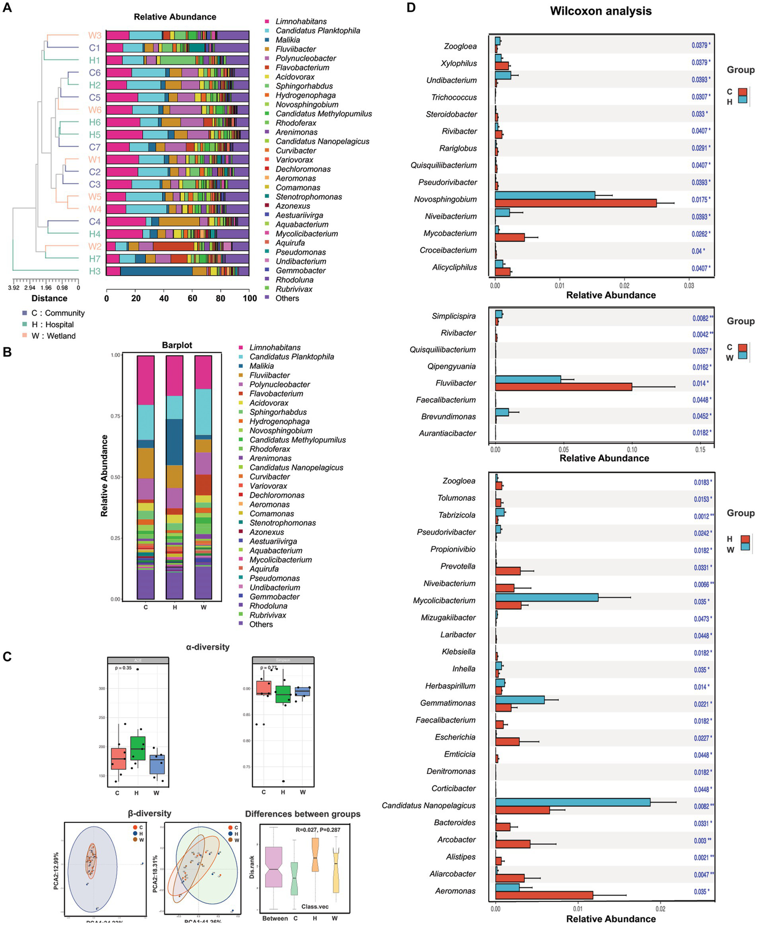 The composition, abundance and diversity of bacterial genera in water samples collected from hospitals, communities, and wetlands, respectively. (A) Characteristics of bacterial genus. The phylogenetic tree on the left was the genetic distance of bacteria in each water source. Different color blocks in the histogram represented bacterial genera. (B) Characteristics of bacterial species. Bar graph showed the overall bacterial distribution in the three water bodies. Different color blocks in the histogram represented bacterial genera. (C) Analysis of α-diversity and β-diversity in three water bodies and the variations between groups. (D) Wilcoxon analysis showed the bacterial genera with significant abundance in pairwise comparisons of each group (C vs. H, C vs. W, H vs. W).