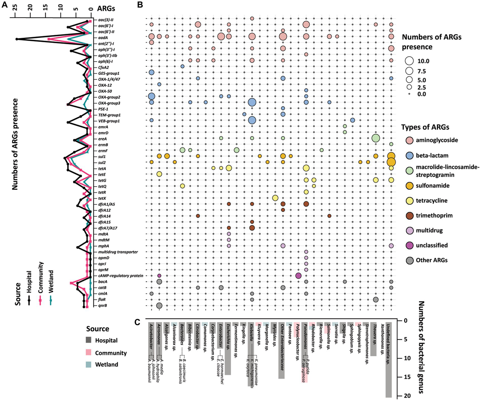 Profile of resistome of water samples from hospital, community, and wetland. (A) The line graph on the left showed the accumulation of ARGs according to the mNGS of the three water bodies. The X-axis showed various ARGs, and the Y-axis was the number of ARGs detected in the water samples. The black line represented the accumulation of ARGs in rivers around hospitals, and red and green lines represent the ARGs near communities and wetlands. (B) Heatmap indicated the accumulation of ARGs in water samples in different bacterial genera. The size of the circle represented the numbers of the accumulated ARGs. The larger circles indicated the higher amount of ARGs in this genus. The colors of the circles represented different classes of antimicrobials. (C) The histogram on the bottom side showed the distribution of strains carrying ARGs among the three water bodies. The X-axis showed different genus of bacteria, and the Y-axis was the number of the bacteria detected in the metagenomics. The black bars were the distribution of bacteria in the hospital water, and the red and green bars were the distribution of bacteria in the community and wetlands.