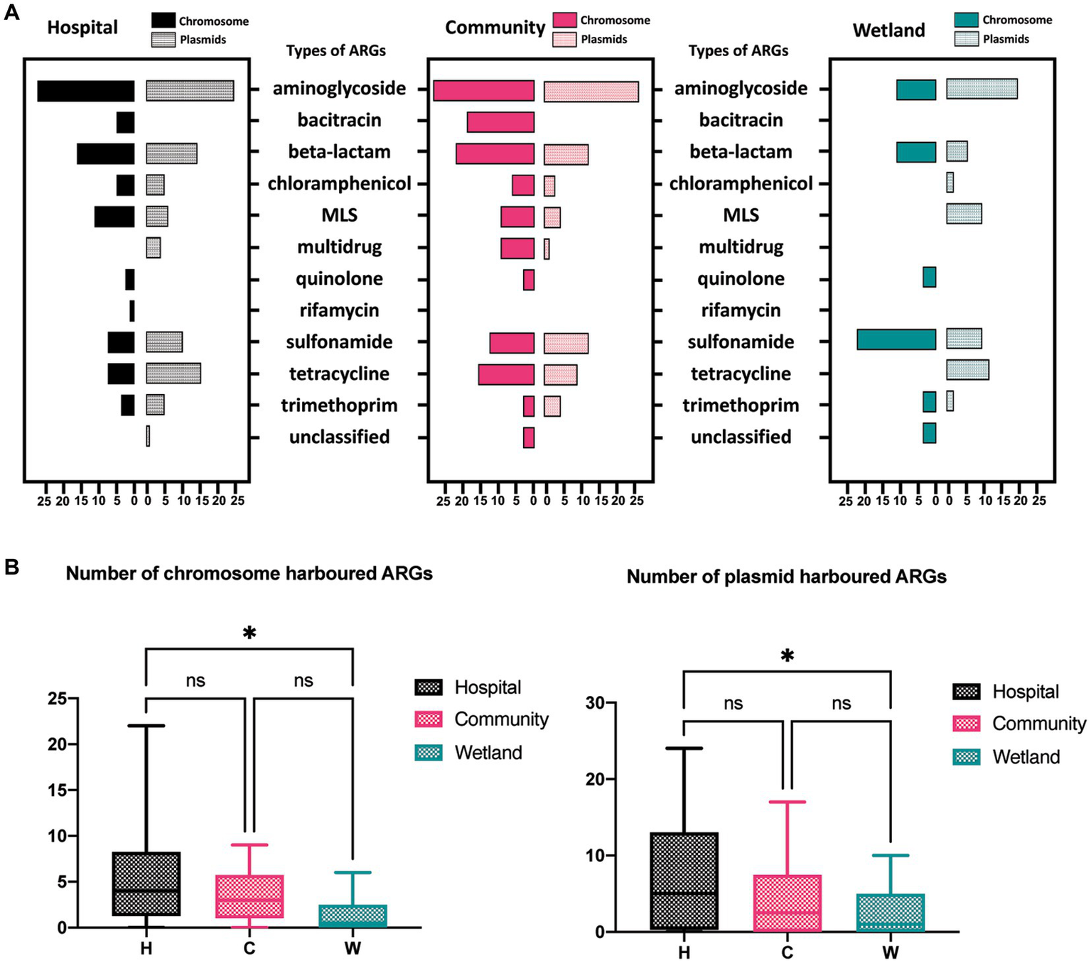 The distribution of ARGs carried by plasmids, and chromosomes in water samples. (A)The barplot showed the overall distribution between hospital, community, and wetland environments. The numbers at the bottom represent the numbers of ARGs carried on chromosomes and plasmids, respectively. (B) Analysis of the difference in the number of ARGs carried by chromosomes and plasmids indicated that the number of ARGs in the water around the hospital was significantly higher than that in the wetland group. *p < 0.05, **p < 0.01, ***p < 0.005, ****p < 0.001.