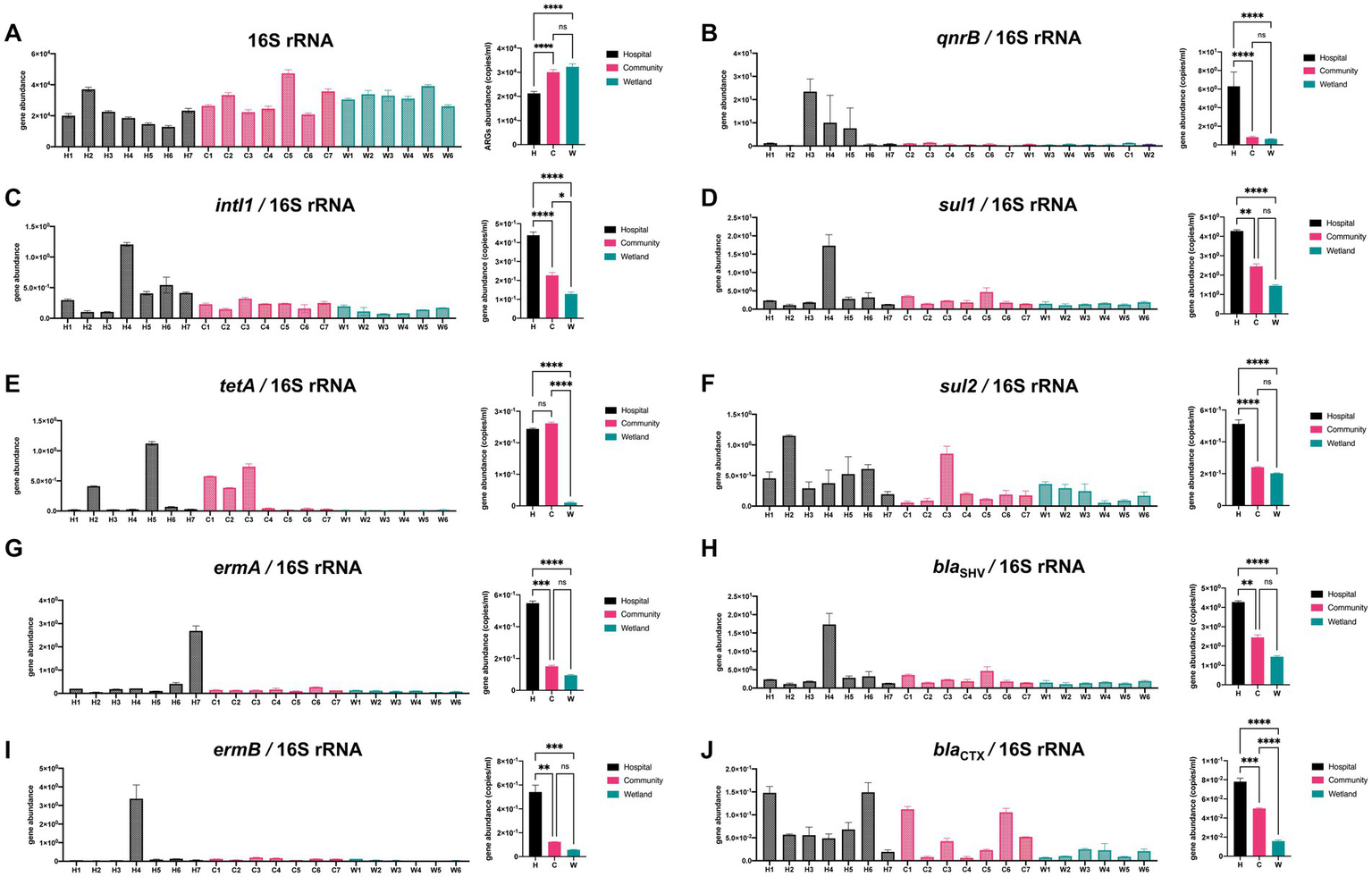 Qualitative PCR was used to detect presence of ARGs in urban aquatic habitats. A total of 12 genes were analyzed including (A) 16S rRNA, (B)qnrB, (C)intI1, (D)sul1, (E)tetA, (F)sul2, (G)ermA, (H)blaSHV, (I)ermB, (J)blaCTX. Both intI1 and ARGs were normalized to the 16 s results. The one-way analysis of variance (ANOVA) was enrolled for calculation with *p < 0.05, ** p < 0.01, *** p < 0.005, **** p < 0.001.