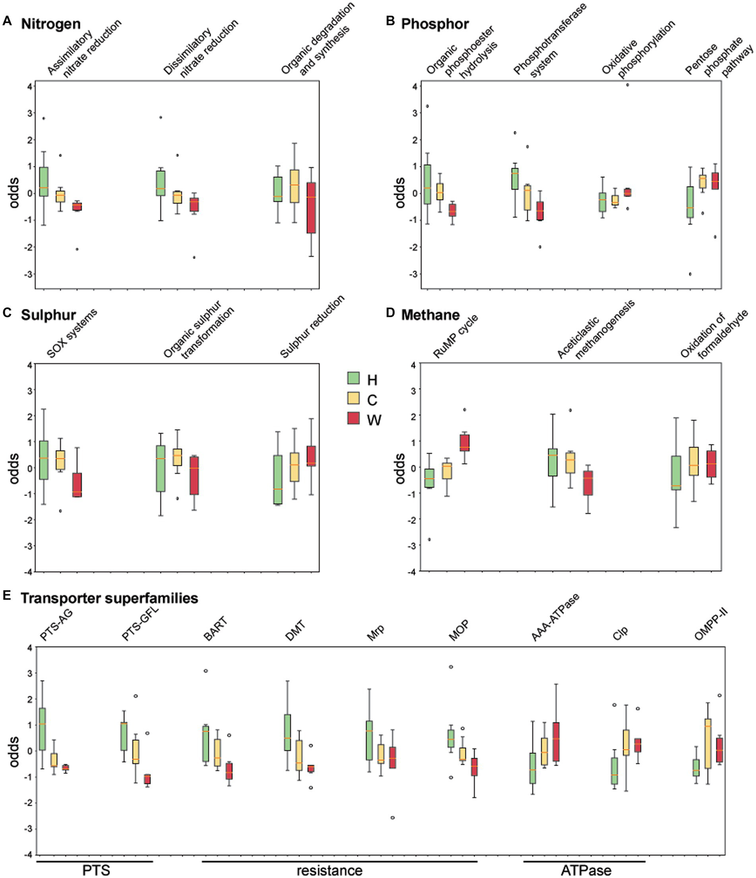 Analysis of chemical index and enzyme metabolic pathways. The coverage of genes associated with (A) nitrogen, (B) phosphor, (C) sulphur, (D) methane, and (E) transporter superfamilies were obtained by comparing against curated datasets in NcycDB, PcycDB, ScycDB, McycDB and TCDB. Sulfur oxides (SOx), ribulose monophosphate (RuMP), phosphotransferase system (PTS), phosphotransferases system (PTS-AG), phosphotransferases system (PTS-GFL), Bile/Arsenite/Riboflavin Transporter (BART), drug/metabolite transporter (DMT), Na + Transporting Mrp (Mrp), multidrug/oligosaccharidyl-lipid/polysaccharide (MOP), ATPases Associated with Diverse Cellular Activity (AAA ATPase), ATP-dependent Clp Protease (Clp), Outer Membrane Pore-forming Protein II (OMPP-II).
