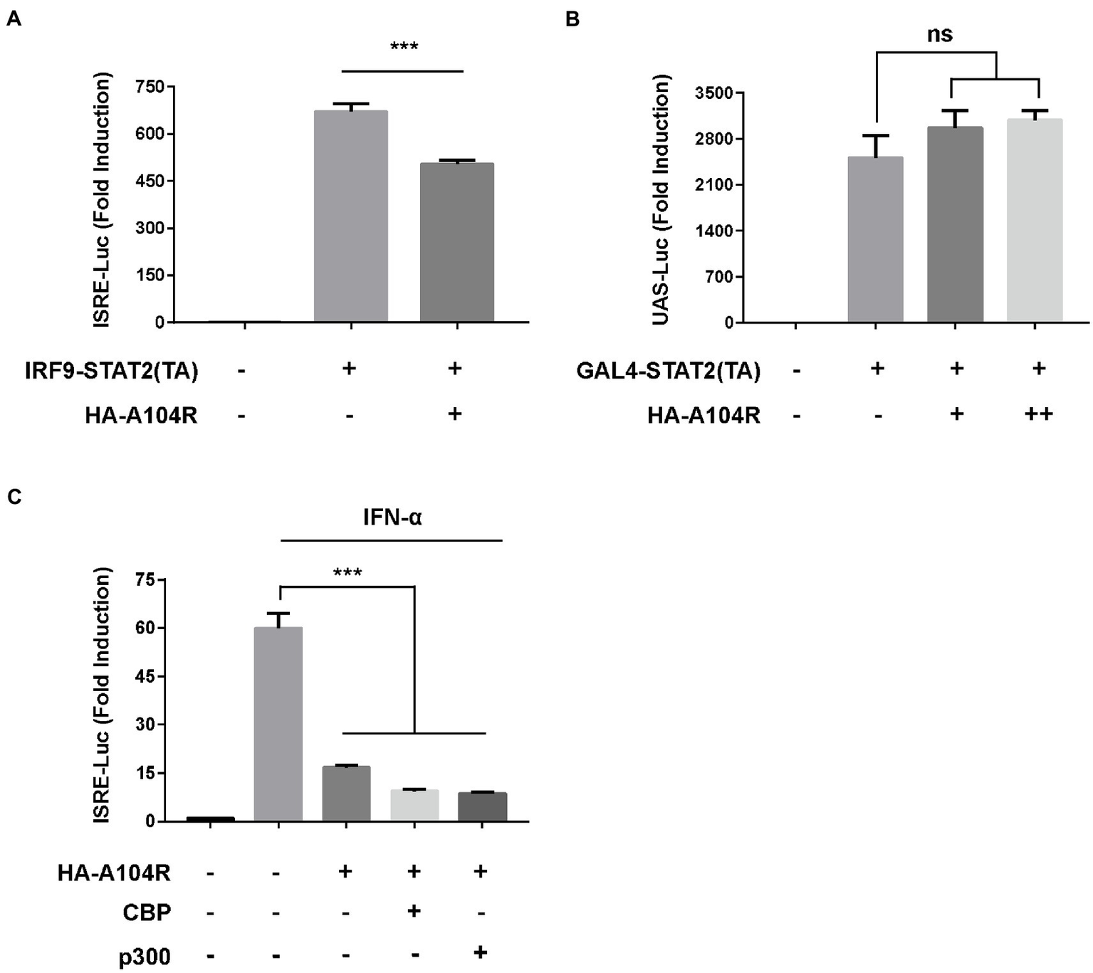 We further investigated whether pA104R played a repressive role downstream of transcription factor binding to promoter regions. The plasmid IRF9-Stat2(TA), a chimera containing the full length of IRF9 and the transactivation domain of STAT2, was used to verify the role of pA104R. As shown in Figure 6A, IRF9-Stat2 (TA) expression significantly activated ISRE promoter activity. Consistently, activation of the ISRE promoter by IRF9-Stat2(TA) was inhibited by the presence of pA104R. Interestingly, this result suggests that the inhibitory effects of pA104R on IFN signaling are STAT1-independent. It is generally accepted that the C-terminus of STAT2 serves as a transcriptional activation domain (TA), which is essential for ISGF3-driven transcription (Qureshi et al., 1996). To further clarify this, we constructed the pGAL4-Stat2(TA) plasmid (Zhang et al., 2008) and examined whether pA104R inhibits the transactivation function of STAT2. The expression of the reporter gene from the pGAL4-UAS-Luc plasmid in HEK-293 T cells was markedly activated by co-transfection with pGAL4-Stat2(TA). However, no noticeable reduction was observed in the transactivation activity driven by pGAL4-Stat2(TA) in the presence or absence of pA104R (Figure 6B), demonstrating that pA104R-mediated inhibition was not due to impairment of the general transcription machinery. It has been demonstrated that STATs and STAT-containing ISGF3 function in transcriptional activation partly through the recruitment of CBP/p300, a ubiquitously expressed global transcriptional coactivator with histone acetyltransferase (HAT) activity (Bhattacharya et al., 1996; Zhang et al., 1998, 2008). As shown in Figure 6C, exogenously expressed CBP/p300 could not restore the reduced ISRE promoter activity by pA104R in response to IFN-α, indicating that pA104R does not exert an inhibitory effect by targeting CBP/p300. Considering all aspects of these data, we speculate that pA104R functions as an antagonist of IFN signaling and may also have epigenetic modification effects involved in the ISG transcription process, which requires further investigations.