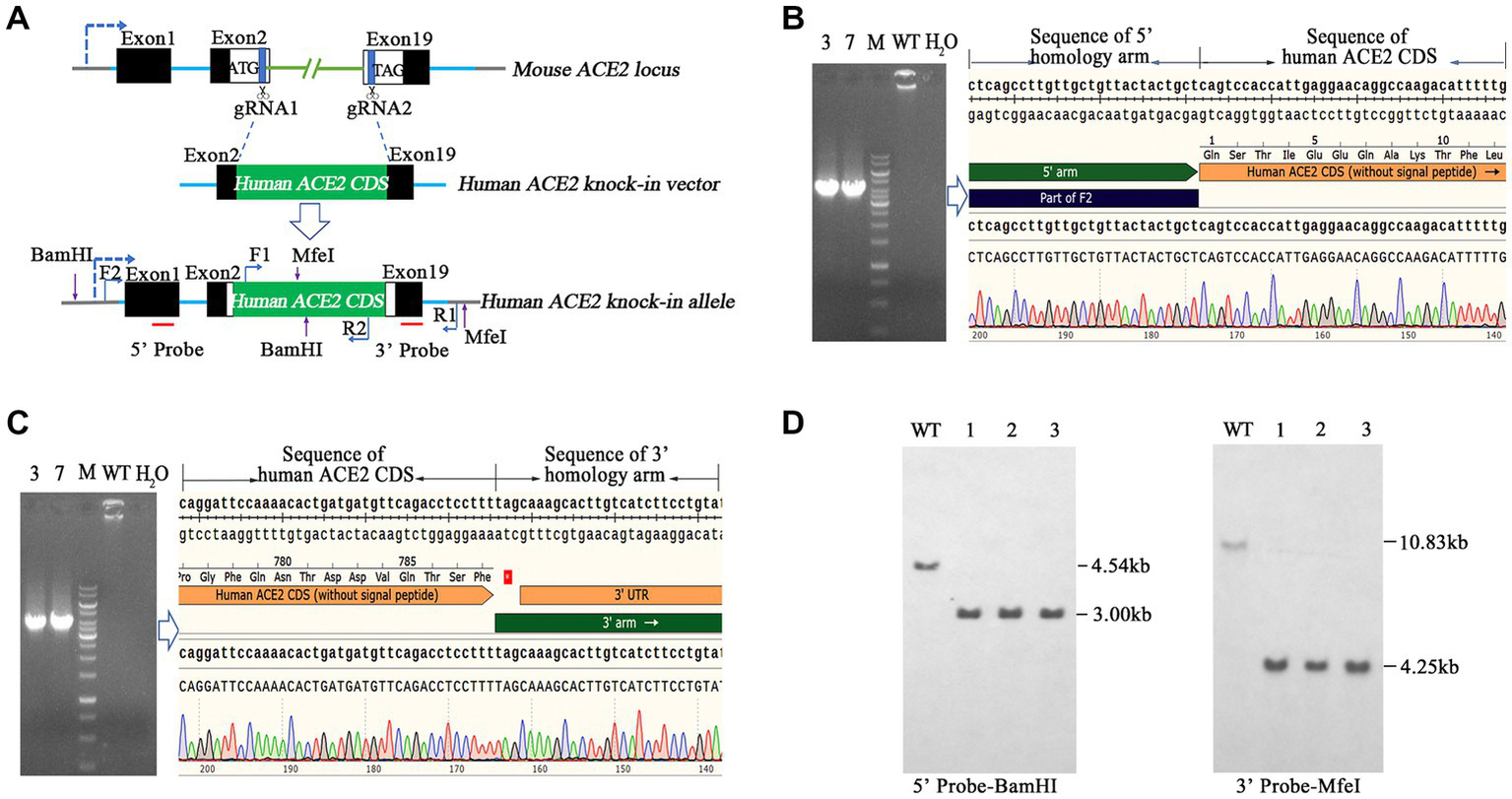 Figure 1. Generation and genetic characterization of human angiotensin-converting enzyme 2 (hACE2) knock-in (KI) mice. (A) The strategy of generation of hACE2 KI mice. A pair of single guide RNAs (sgRNAs) cutting exons 2 and 19 of mouse ACE2, respectively, was used to replace the translated exons of mouse ACE2 with the human ACE2 coding sequence (CDS) without the sequence coding signal peptide, and the human ACE2 CDS with signal peptide was placed downstream the sequence coding mouse ACE2 signal peptide as a result. Black boxes: untranslated exonic sequences of mouse ACE2; white boxes: translated exonic sequences of mouse ACE2; green box: human ACE2 CDS without signal peptide; blue lines: introns of mouse ACE2; the arrow in dotted line: the transcription direction; F1, F2, R1, and R2 show the positions of primers used for genetic screening of hACE2 KI mice; red lines indicate the locations of probes for Southern blotting. (B,C) Transgenic founder mice were subjected to genetic screening by PCR using primer pairs F2/R2 (B) and F1/R1 (C), which covered the 5′ and 3′ junction regions of hACE2 KI allele, respectively. The PCR products were sequenced and the sequence chromatography images are shown. (D) Southern blotting of homozygous hACE2 KI individuals. The genomic DNAs of the homozygous individuals were completely digested by the endonucleases BamHI and MfeI, and then subjected to Southern blotting using the 5′ and 3′ probes shown in A, respectively. The sizes of Southern blot bands with the 5′ probe were 4.54 kb in the wild-type (WT) allele and 3.00 kb in the hACE2 KI allele, and those with 3′ probe were 10.83 kb in the WT allele and 4.25 kb in the hACE2 KI allele. WT: wild-type mouse genomic DNA; ~1–3: homozygous KI individuals.