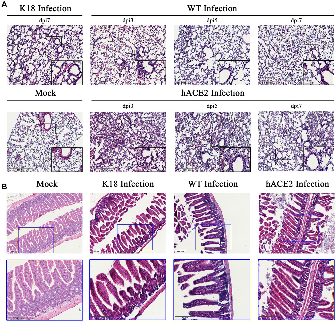 Figure 4. Histopathological changes in hACE2-KI mice infected with SARS-CoV-2. (A) Hematoxylin and eosin (H&E) staining of lung sections from hACE2-KI and WT mice after intranasal inoculation with 1 × 105 PFU per mouse at 3, 5, and 7 dpi. K18-hACE2 lung tissue collected at 7 dpi is shown. (B) H&E staining of intestine sections from hACE2-KI, WT, and K18-hACE2 mice after intranasal inoculation with 1× 105 PFU per mouse at 7 dpi. Images are representative of each study group.